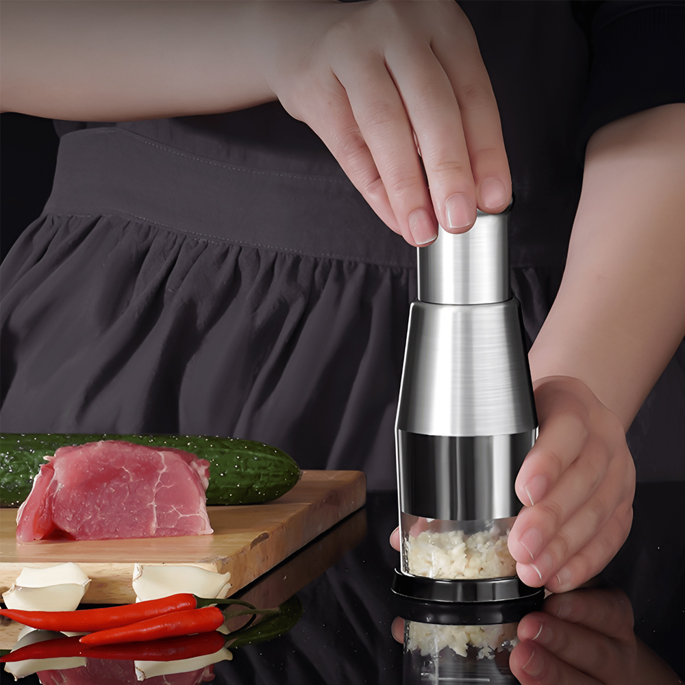 這款不鏽鋼手壓搗蒜器特別適合經常下廚的你,解決了手動切蒜費時費力、氣味殘留的困擾。只要放入蒜仁、辣椒或洋蔥,蓋上蓋子輕鬆按壓,內建的彈簧結構省力好壓,不鏽鋼刀片會自動旋轉,幾秒內就完成均勻碎末,備料從此乾淨俐落。