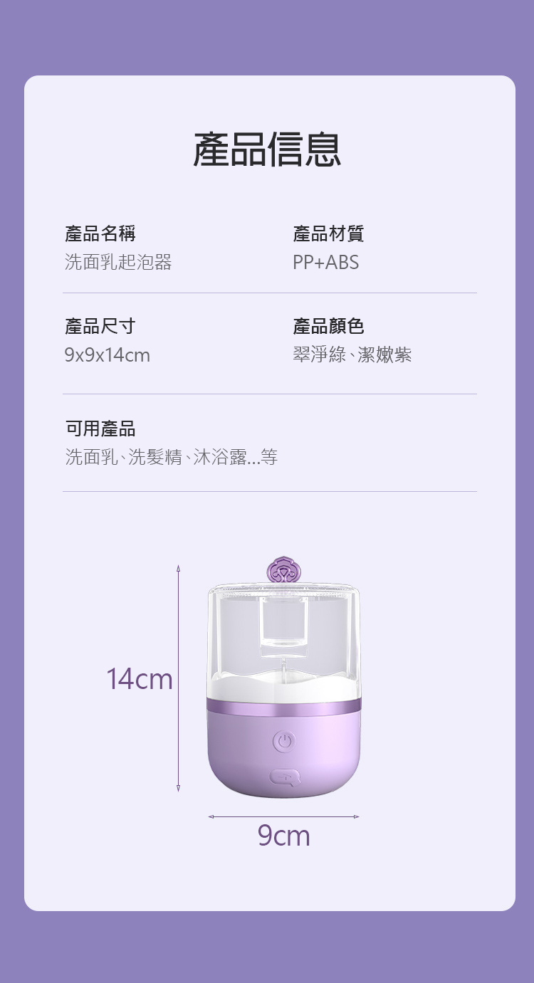 讓這台美妙的泡沫慕斯機器🌟帶領您進入純淨的洗顏新境界。只需一滴洗面乳,它就能為您打造出如雲朵般綿密的泡沫,輕柔覆蓋每寸肌膚,深入毛孔帶走汙垢,恢復您的肌膚純淨。無論是濃稠乳膏狀或是較水的凝膠狀,兩檔調節滿足您不同的需求。一次充飽電,長達一月的使用壽命💖,這是您美麗日常不可或缺的夥伴。✨名稱:洗面乳起泡器材質:PP+ABS尺寸:9x9x14cm顏色:翠淨綠、潔嫰紫可用產品:洗面乳、洗髮精、沐浴露…等