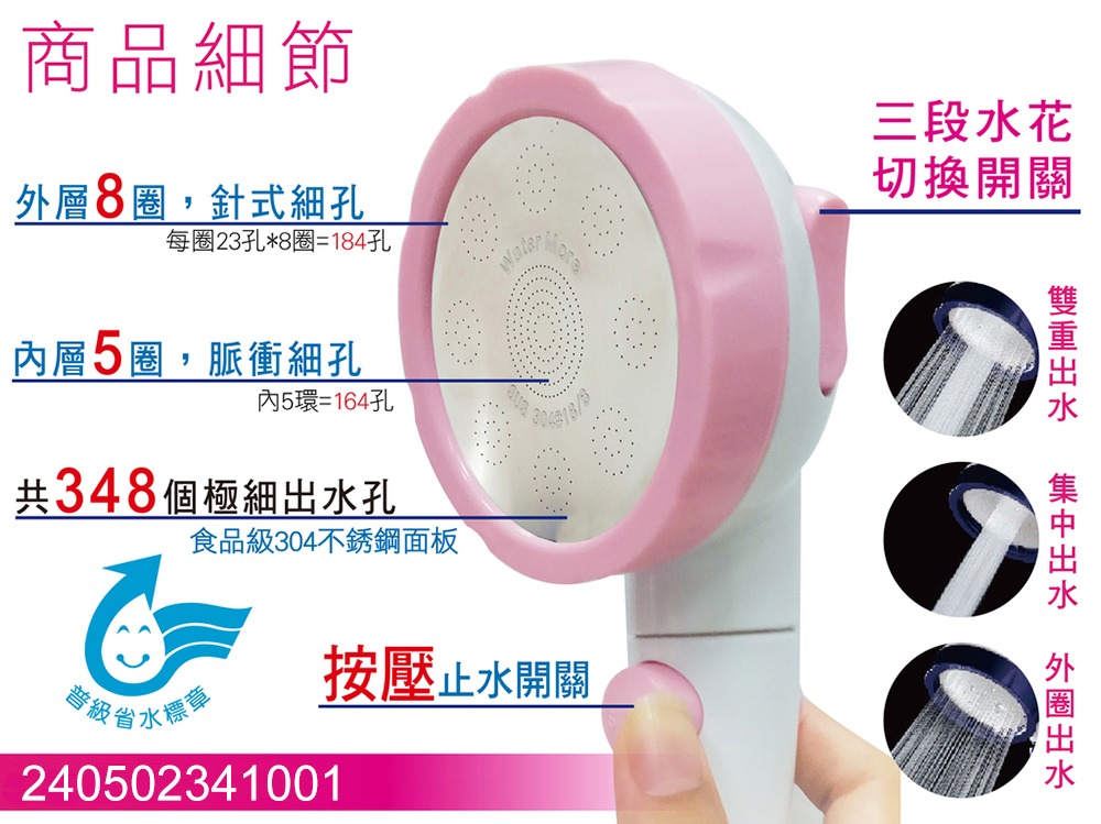 品名:三段增壓可止水負離子花灑 型號:WM-158N尺寸:長23.5cm*高5cm*寬8cm(噴頭寬度) 材質:ABS塑料、不鏽鋼 顏色:主體-白色 噴頭蓋-粉紅、粉藍、白色(隨機出貨)重量:188.5g/pc 省水標章使用人:春佰億企業有限公司許可編號:240502341001地址:236 新北市土城區忠承路101號2樓