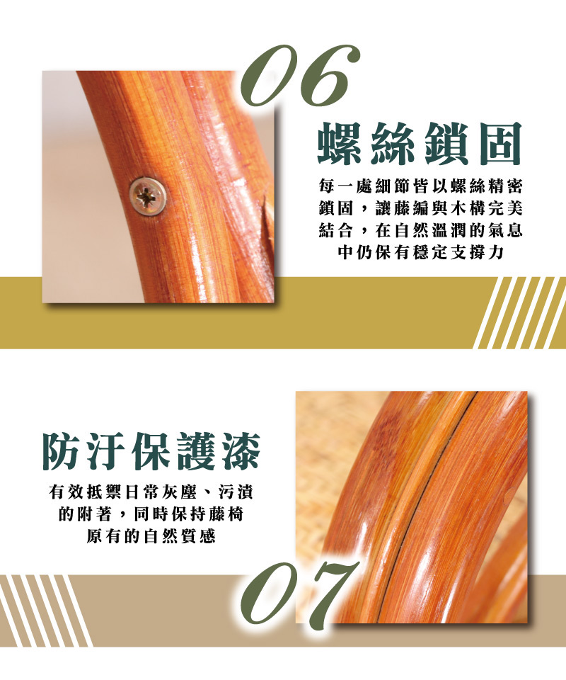 防汙保護漆,有效抵禦日常灰塵、污漬的附著,同時保持藤椅原有的自然質感。
