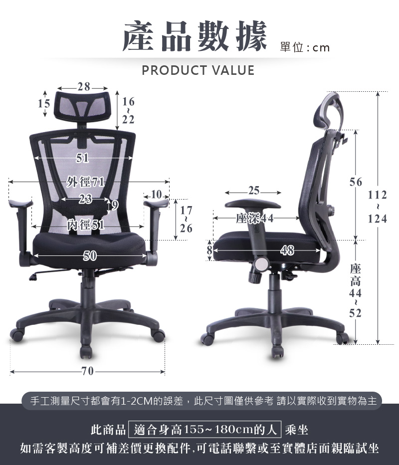 坐高44 ~ 52cm、坐寬50cm、坐深44cm