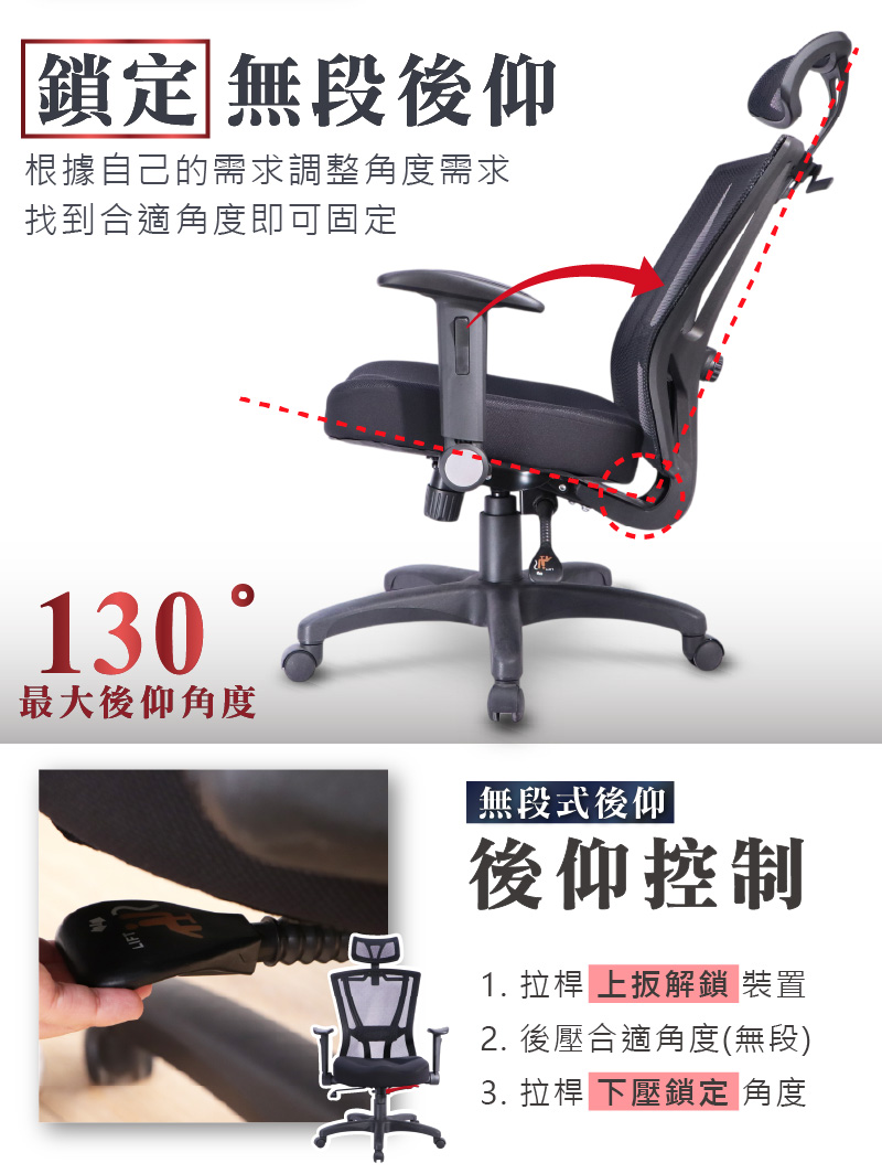 無段後仰可根據自己的需求調整角度,提升舒適度與支撐性。