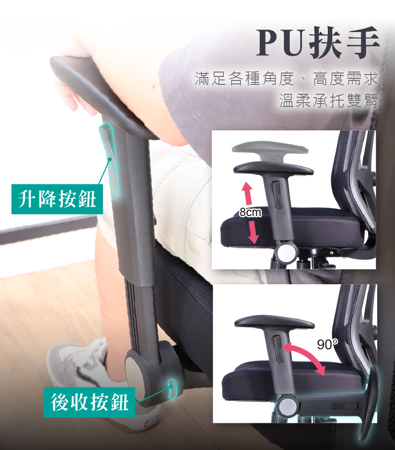 軟質PU扶手溫柔承托雙臂,單鈕操作方便,可90度後收、上下升降。
