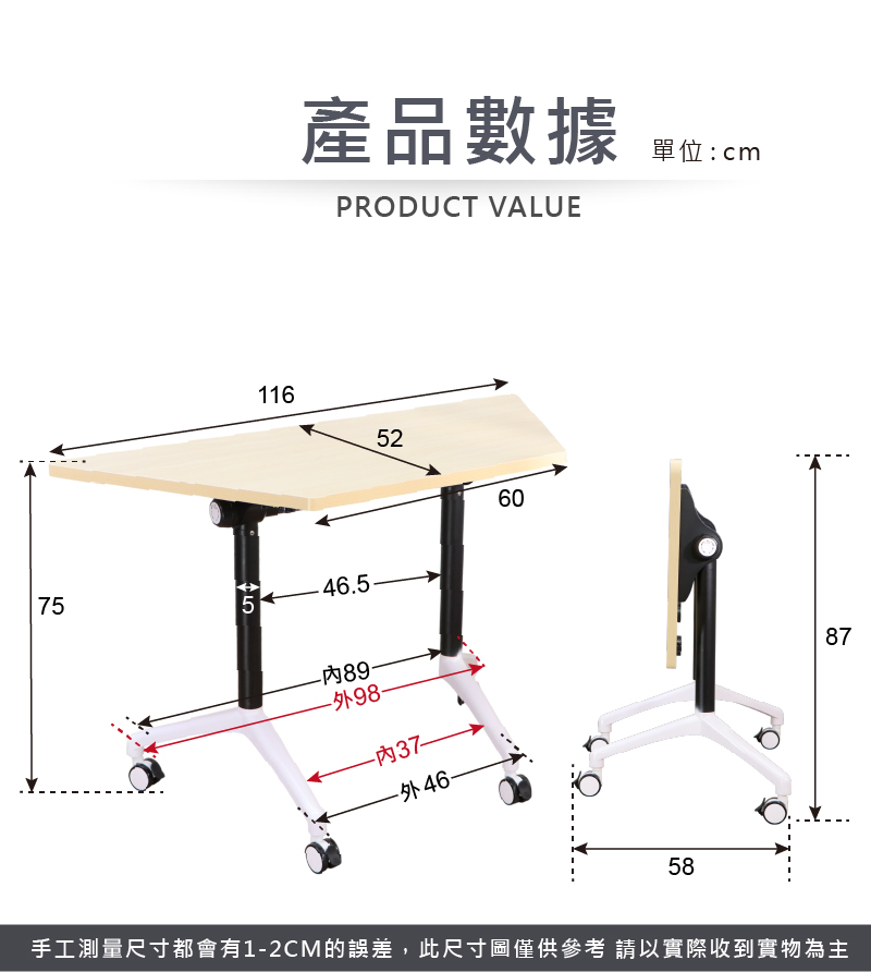✔使用堅固鐵管烤漆,搭配三角交叉底盤支架設計,使受力穩固,有效分散和承受各個方向的力量,除了提高桌面承載力,進而延長產品的使用壽命
