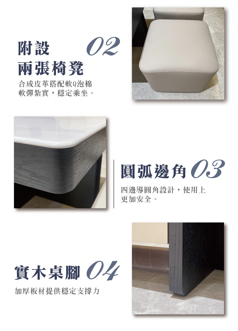 ●產品材質:微晶石大理石紋桌面、胡桃色實木桌板、抽屜面板塑合板烤漆、合成皮面泡棉小椅凳