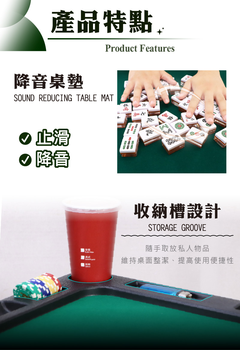 四邊桌腳附設三角穩固支撐鉸鍊,安全卡榫確保桌子穩固性。