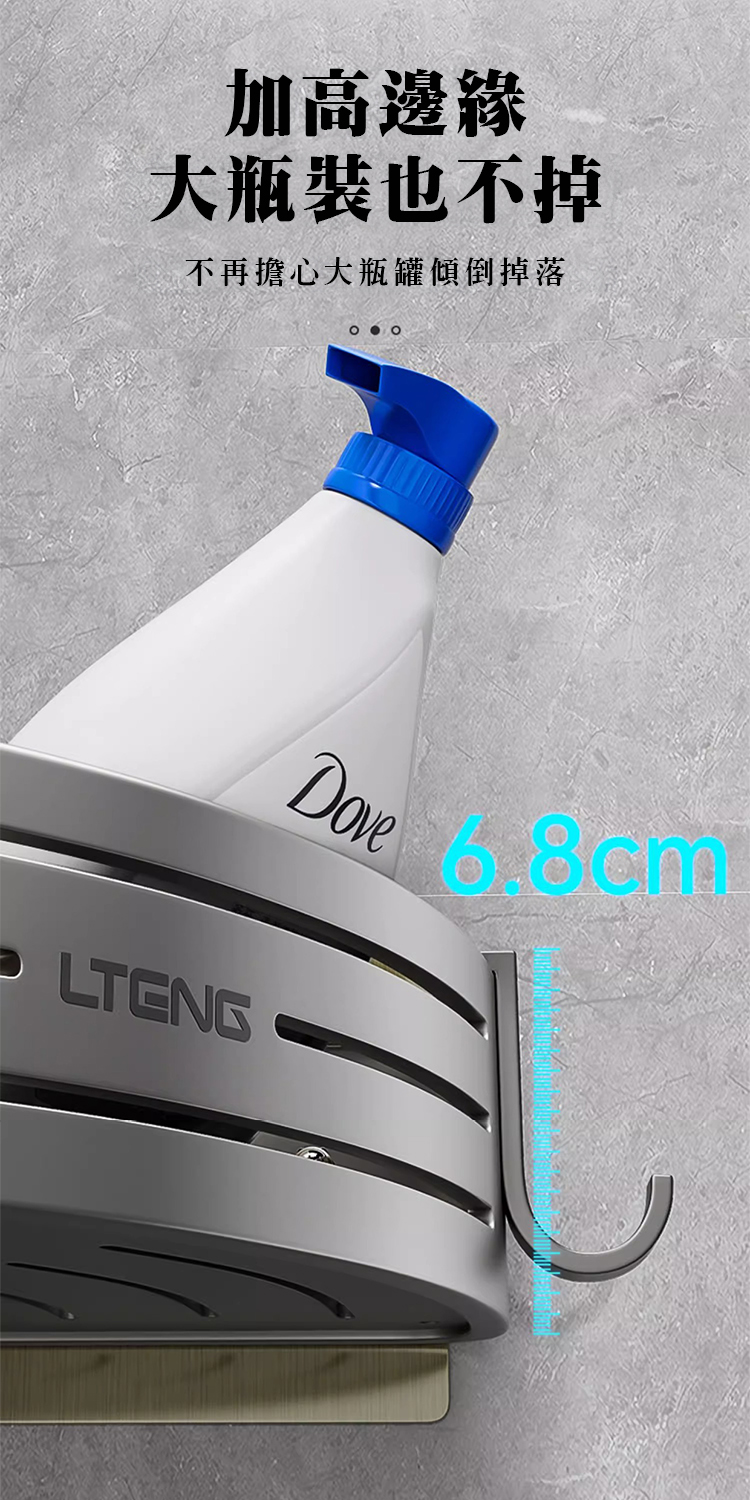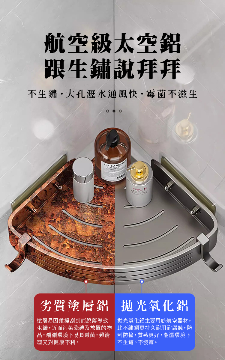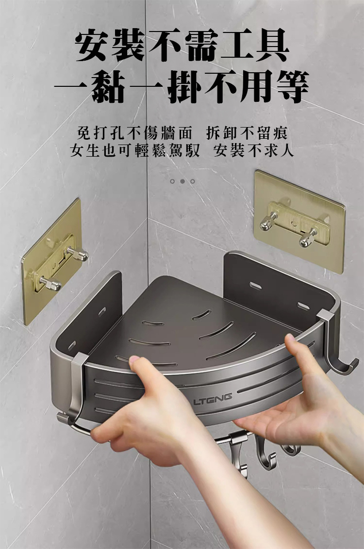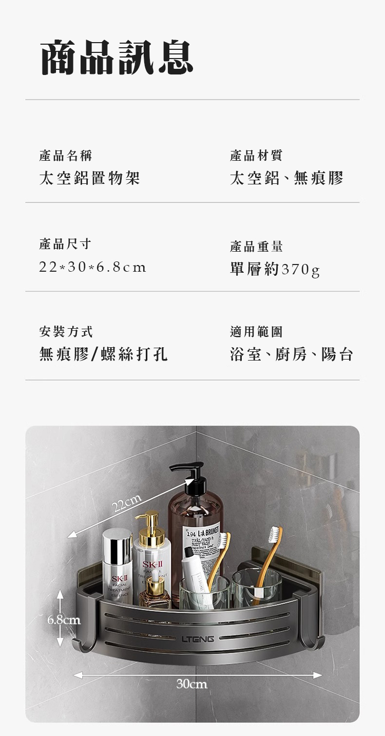 讓收納變得輕鬆又時尚🌈!這款三角形置物架免打孔,靠強力貼片輕貼牆上,即刻變身為您的儲物好幫手🛠️。太空鋁材質,堅固不生鏽,專為潮濕環境設計。高邊框6.8cm,大罐洗浴用品也穩如泰山🚿。底部鏤空,告別積水,保持架上物品常乾爽。無論是浴室、廚房還是陽台,都是完美選擇🏠。快為您的生活增添這個實用又美觀的收納神器吧!💎【產品信息】品名:太空鋁置物架材質:太空鋁、強力貼片、優質五金尺寸:22*30*6.8cm單層重量:約370g安裝方式:無痕膠/螺絲打孔適用範圍:浴室、廚房、陽台