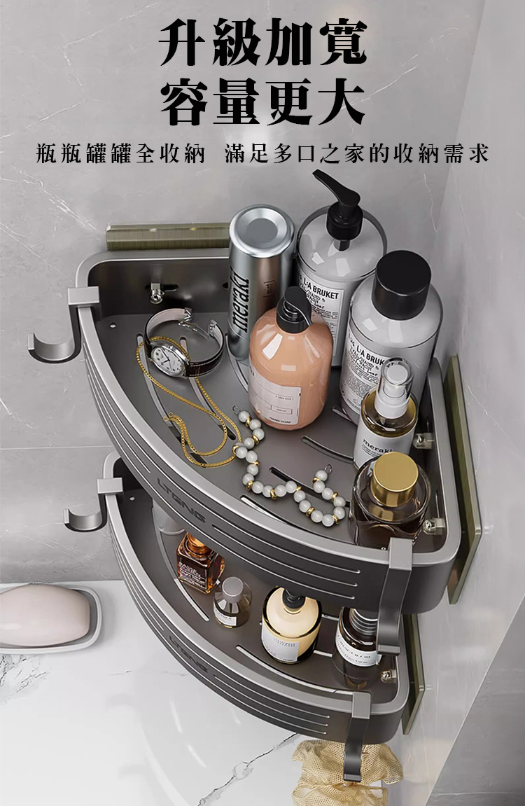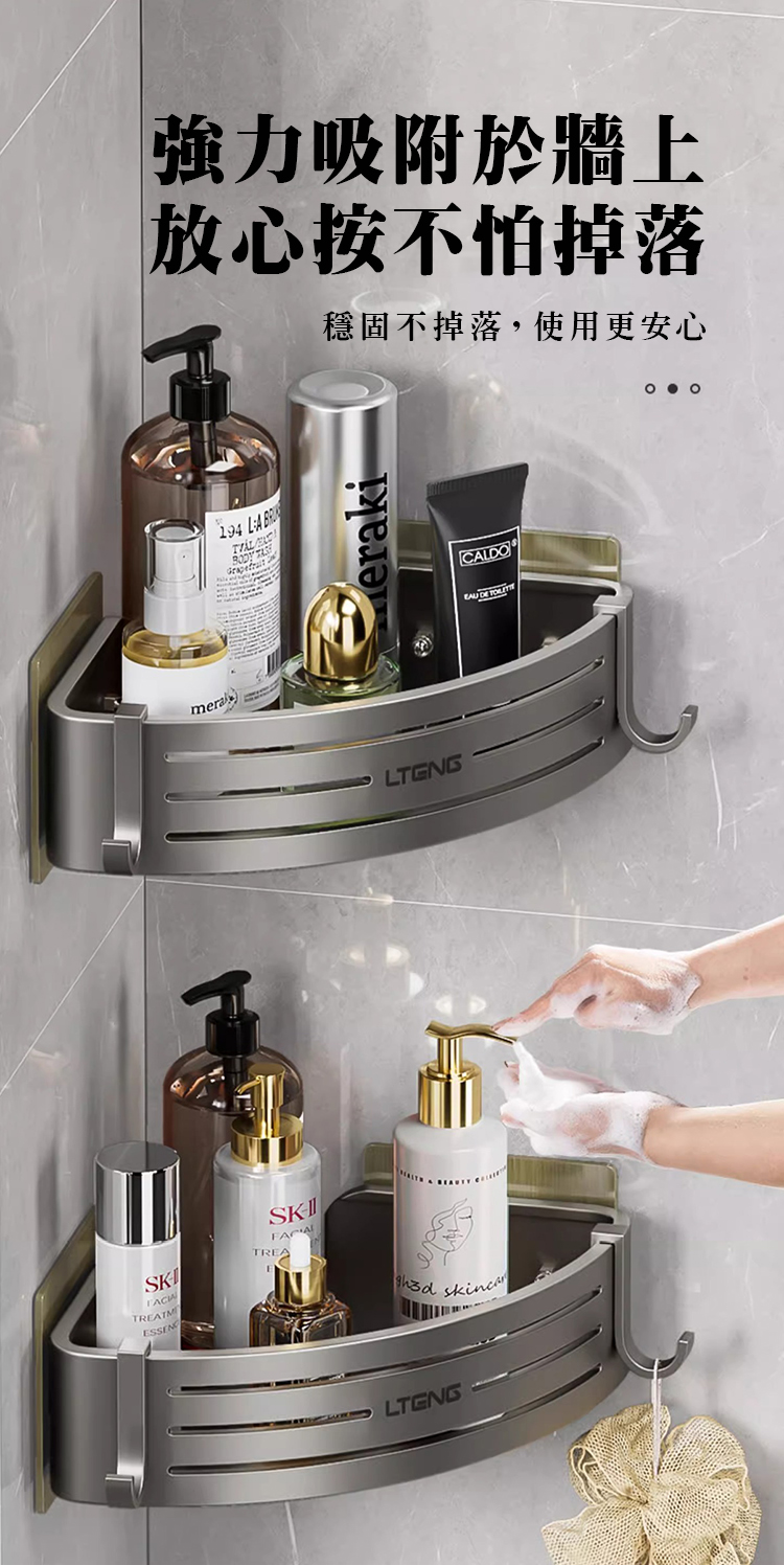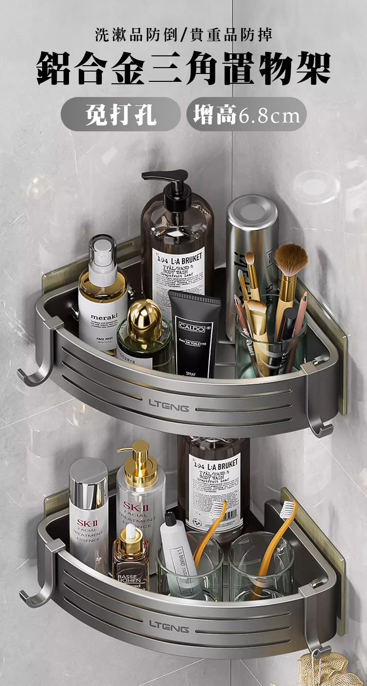 讓收納變得輕鬆又時尚🌈!這款三角形置物架免打孔,靠強力貼片輕貼牆上,即刻變身為您的儲物好幫手🛠️。太空鋁材質,堅固不生鏽,專為潮濕環境設計。高邊框6.8cm,大罐洗浴用品也穩如泰山🚿。底部鏤空,告別積水,保持架上物品常乾爽。無論是浴室、廚房還是陽台,都是完美選擇🏠。快為您的生活增添這個實用又美觀的收納神器吧!💎【產品信息】品名:太空鋁置物架材質:太空鋁、強力貼片、優質五金尺寸:22*30*6.8cm單層重量:約370g安裝方式:無痕膠/螺絲打孔適用範圍:浴室、廚房、陽台