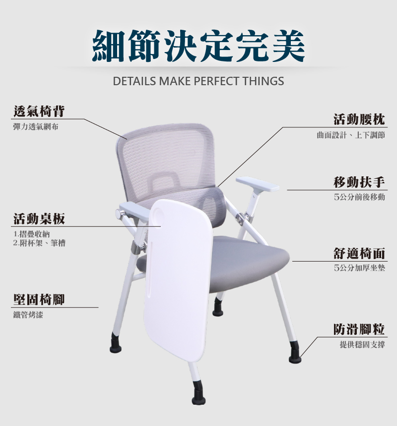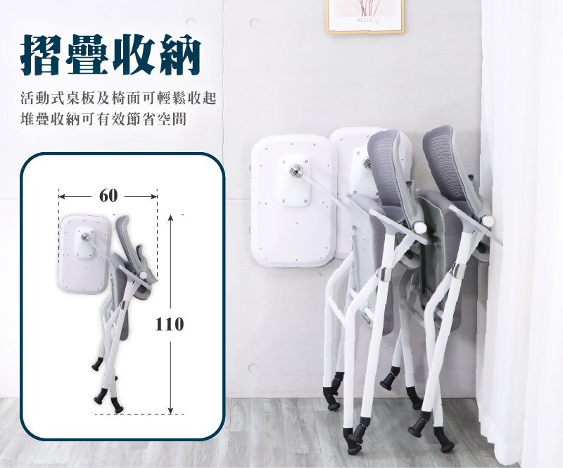 ★摺疊收納活動式桌板及椅面可輕鬆收起,可多張疊放排列,有效節省空間。