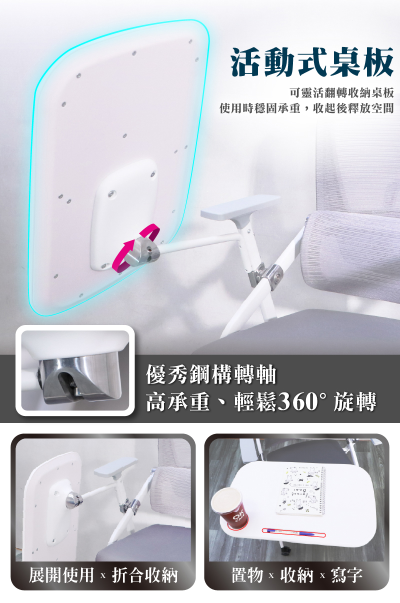 桌板可靈活翻轉收納,使用時穩固承重,收起後釋放更多空間。