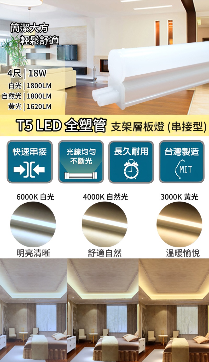 【SY 聲億科技】4呎18W LED T5全塑層板支架燈-2P公母座-串接型 白光 2入