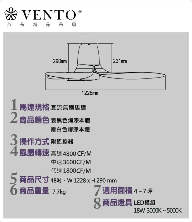 【VENTO芬朵】48吋 DC直流馬達 AEOLOS系列 有燈款 遙控吊扇 霧黑/霧白色 台灣製造