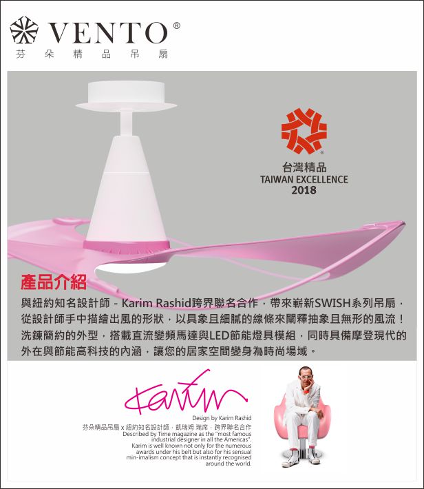 由當代最具創造力的設計大師 Karim Rashid 親自操刀,以圓潤流線搭配大膽配色,勾勒出前衛而充滿生命力的造型,成為設計愛好者心中的經典之選。搭載DC 節能馬達 與 11 瓦可調光 LED 燈,不只外型搶眼,更帶來舒適而強勁的風感,讓美感與實用在生活中自然交融。榮獲 2018年德國iF產品設計獎,及同年度台灣精品獎,是一件真正融合視覺魅力與功能價值的當代設計作品。