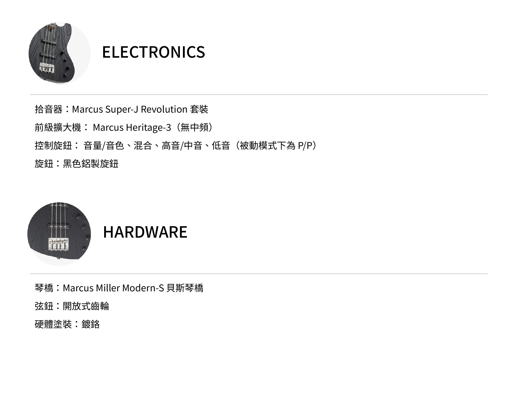V6 內建 Marcus Heritage-3 主動 EQ,同時支援 push/pull 被動切換,實用性遠勝傳統被動貝斯。