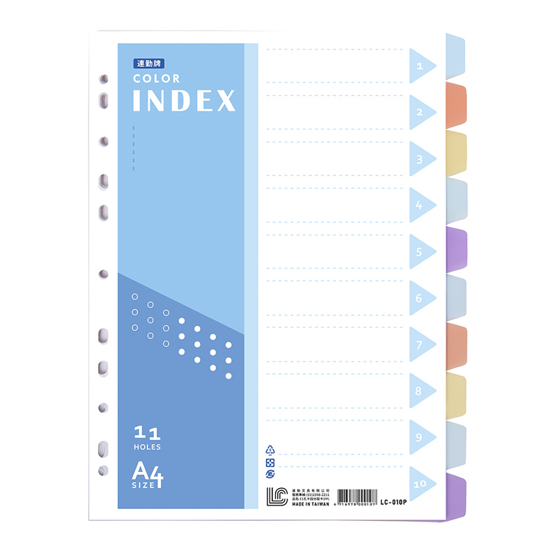 商品說明 ★編號:LC-010P ★規格:長297×寬226mm ★材質:聚丙烯(PP)、紙 • 適用於分隔十段式不同資料總類,顏色鮮明好辨識,可套用於多種孔夾內使用。 廠商代號:XF 責任代碼:5UX