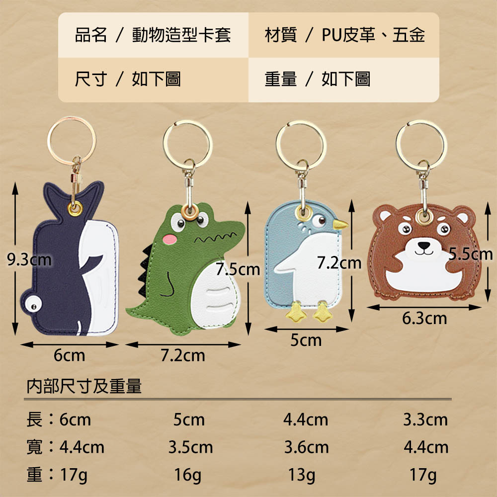 【產品訊息】品名:動物造型卡套材質:PU皮革、五金尺寸:大象/鯨魚/黑馬-9.3*6 cm 綠鱷魚/黃鱷魚-7.5*7.2 cm 三色企鵝-7.2*5 cm 棕熊/綠青蛙-5.5*6.3 cm厚度:約3mm重量:約13~17g