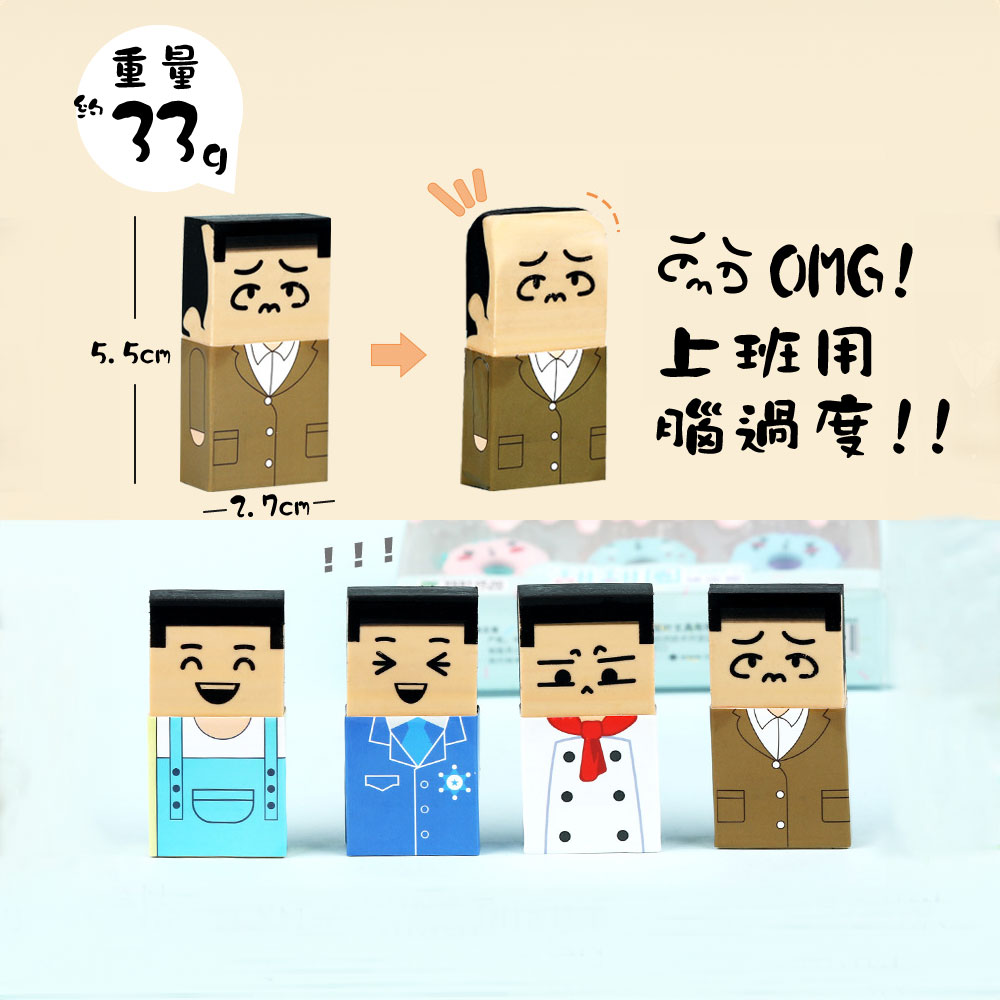 帥哥變老頭禿頭橡皮擦趣味造型:提供禿頭廚師、禿頭警察、禿頭老闆和禿頭工人等多款造型,讓你的文具更加有趣味性。療育娛樂:每個造型都有多種表情,能夠帶給你一天的疲憊,讓你在使用橡皮擦的同時得到放鬆。耐用材質:採用軟Q材質,不易斷裂,擦得乾乾淨淨,適合長時間使用。尺寸:5.5*2.7cm重量:33g這款帥哥變老頭禿頭橡皮擦不僅是一個實用的文具,還可以為你的日常生活增添一些趣味和樂趣。適合作為禮物送給朋友或自己使用,絕對能夠成為你的文具收藏中的亮點!