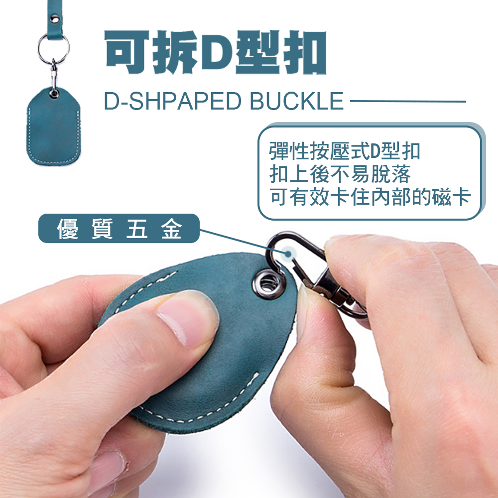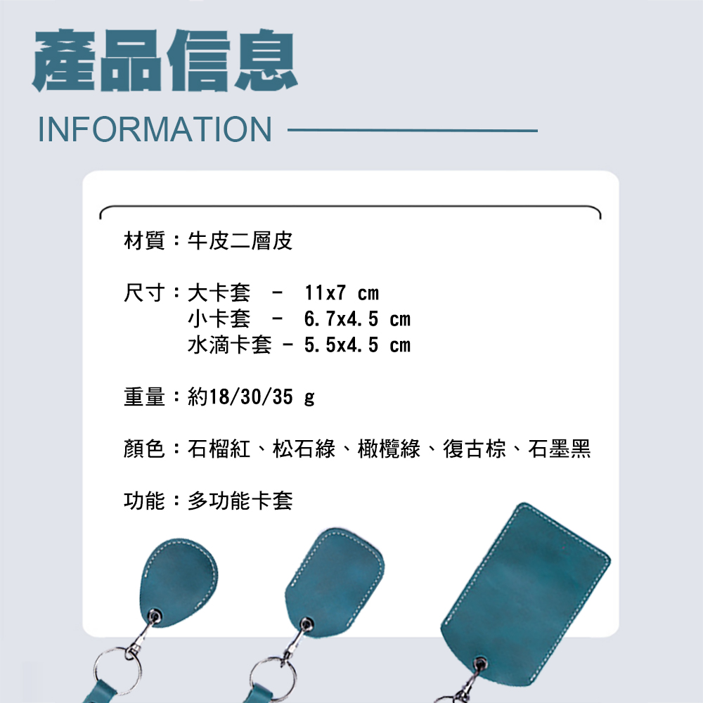【產品特色】二層頭牛皮真皮:透氣、耐磨、柔軟有彈性可拆D型扣:彈性按壓式D型扣,扣上後不易脫落,可有效卡住內部的磁卡磁卡放置:可裝入之多種類形的磁卡精密縫線:結實牢固、不易脫線【關於客製化刻字/圖】①請先於聊聊私訊,與小幫 手溝通想刻的字或圖案。②確認好內容後於賣場中下單所需的 1.皮套顏色與 2.服務,分別加入購物車③收到訂單後我們即開始製 作(因全人工製作,所以 需3-5個工作天唷~)【產品信息】材質:牛皮二層皮尺寸:大卡套 - 11x7 cm 小卡套 - 6.7x4.5 cm 水滴卡套 - 5.5x4.5 cm (可裝入之磁卡尺寸請見圖片)重量:約大卡套 - 18 g 約小卡套 - 30 g 約水滴卡套 - 35 g顏色:石墨黑、復古棕、松石綠、石榴紅
