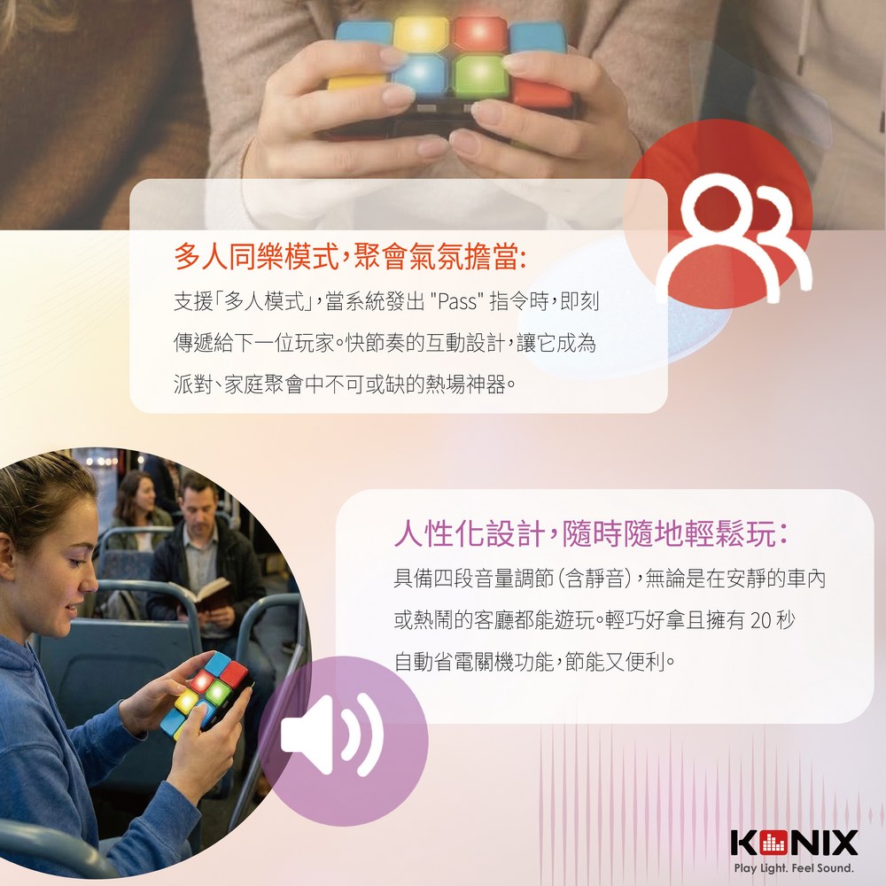 KONIX感官魔方支援「多人模式」,當系統發出 "Pass" 指令時,即刻傳遞給下一位玩家。快節奏的互動設計,讓它成為派對、家庭聚會中不可或缺的熱場神器。