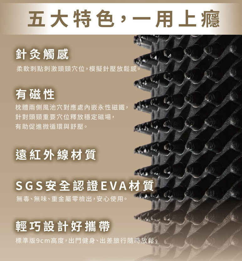 顏色:黑尺寸:16 x 16 x 9 cm材質:高密度無毒EVA泡綿、遠紅外線、永久性磁鐵淨重:152 g產地:台灣製造