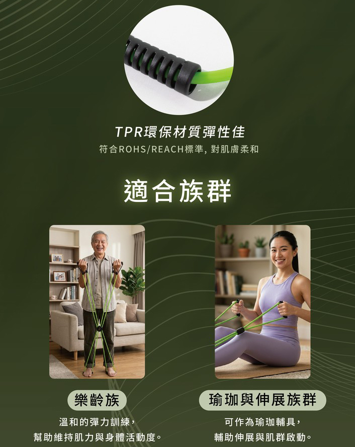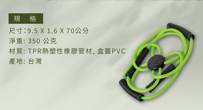 商品規格:顏色:綠色尺寸:9.5 x 1.6 x 70 cm材質:TPR熱塑性橡膠管材、盒蓋PVC淨重:350 g產地:台灣製造