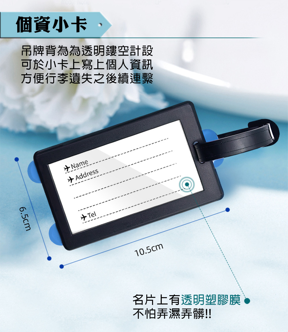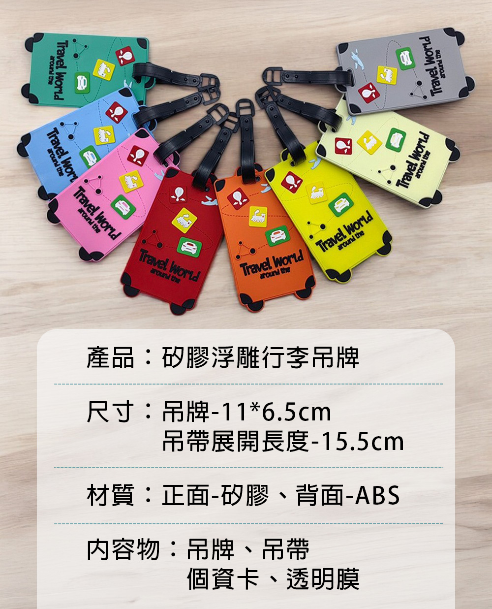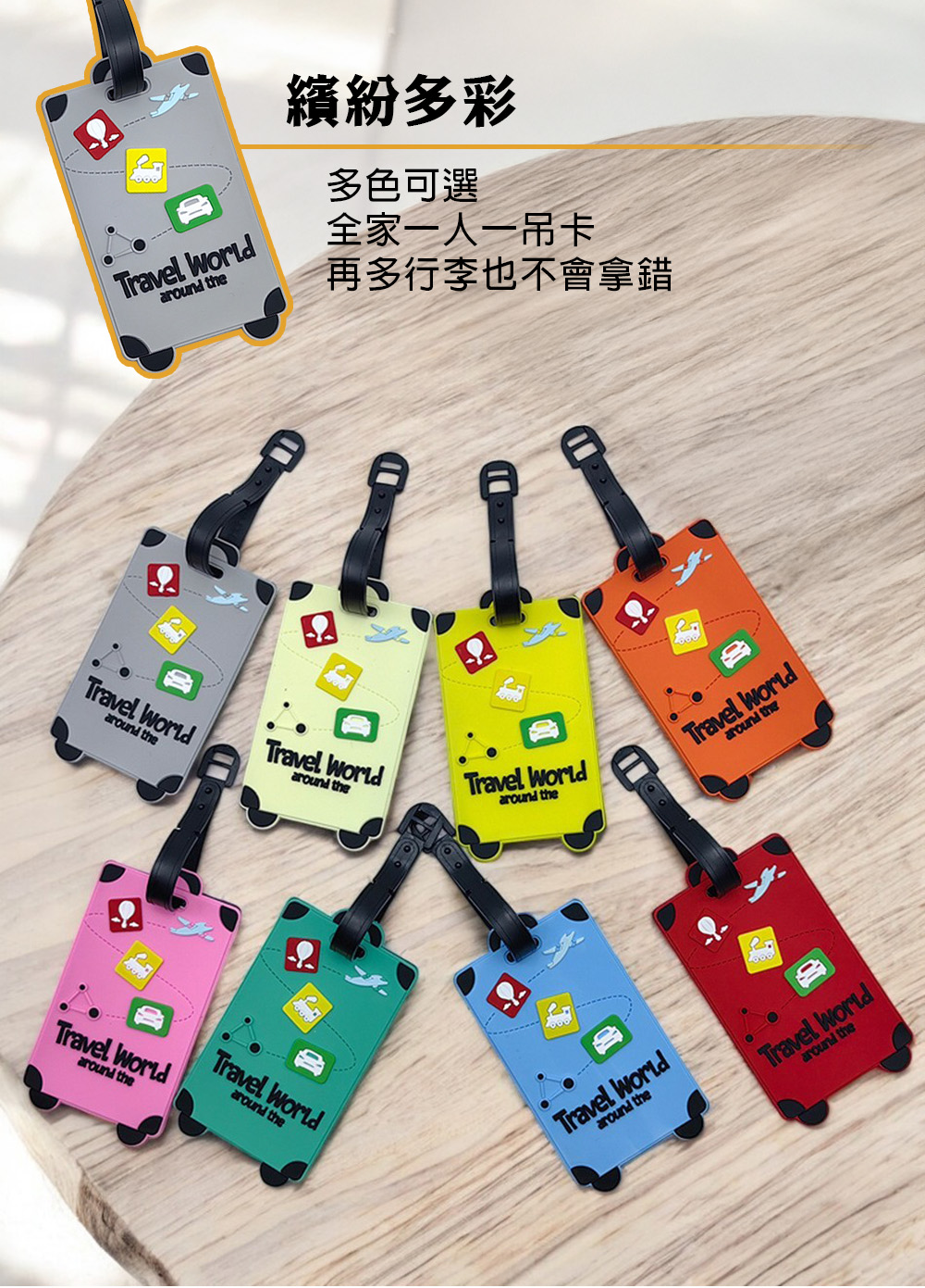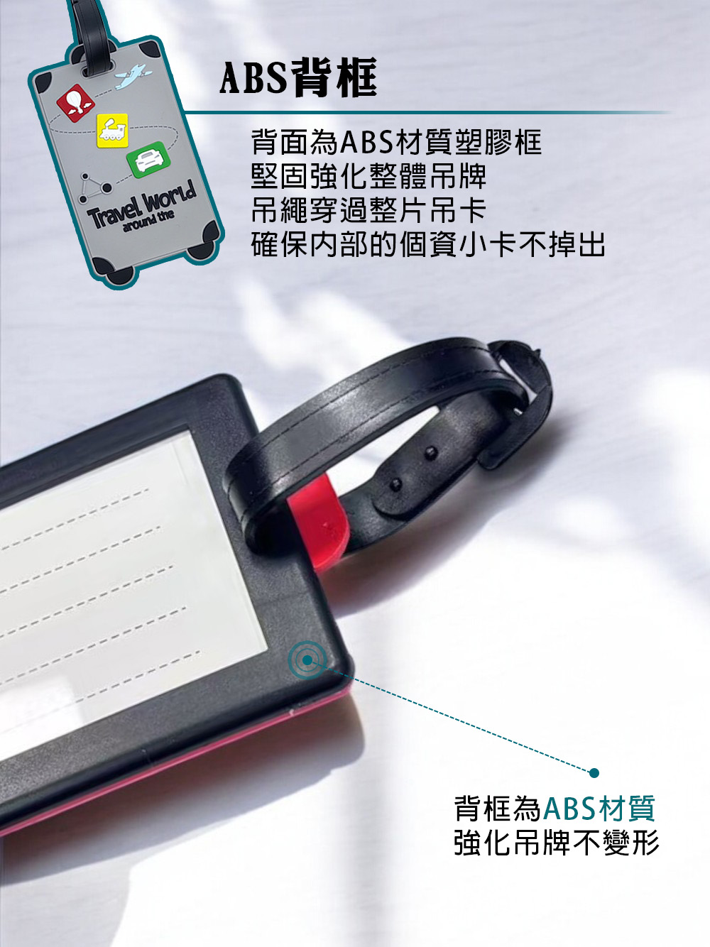 ✈️ 讓你的行李永不迷路!獨特多色行李吊牌不只防水防刮的矽膠材質背後的個資小卡,還有透明膜保護讓你的資訊不會弄髒或不見商務出差、蜜月旅行、遊學打工,隨時保護你的行李安全出國玩、返鄉過節,在行李輸送帶前一眼就認出你的行李省去找箱子的煩惱!吊牌上的旅行小圖標,陪你記錄每一段精彩旅程 🌎 特製掛帶設計,雙重卡榫堅固耐用不易掉落為你的行李箱增添獨特風格與實用保障 🧳【產品信息】產品:矽膠浮雕行李吊牌尺寸:吊牌-11*6.5cm 吊帶展開長度-15.5cm材質:正面-矽膠、背面-ABS內容物:吊牌、吊帶 個資卡、透明膜