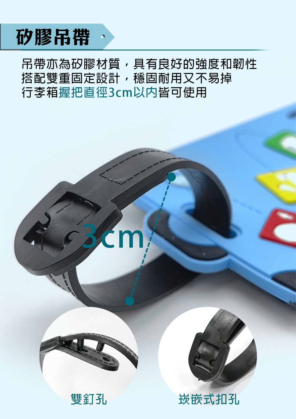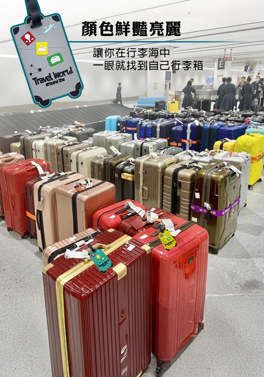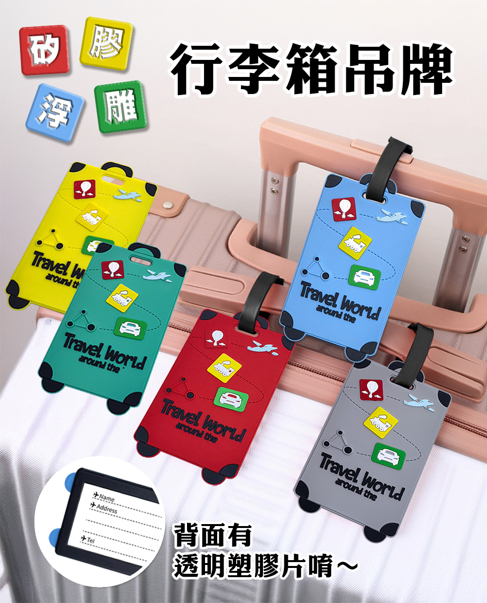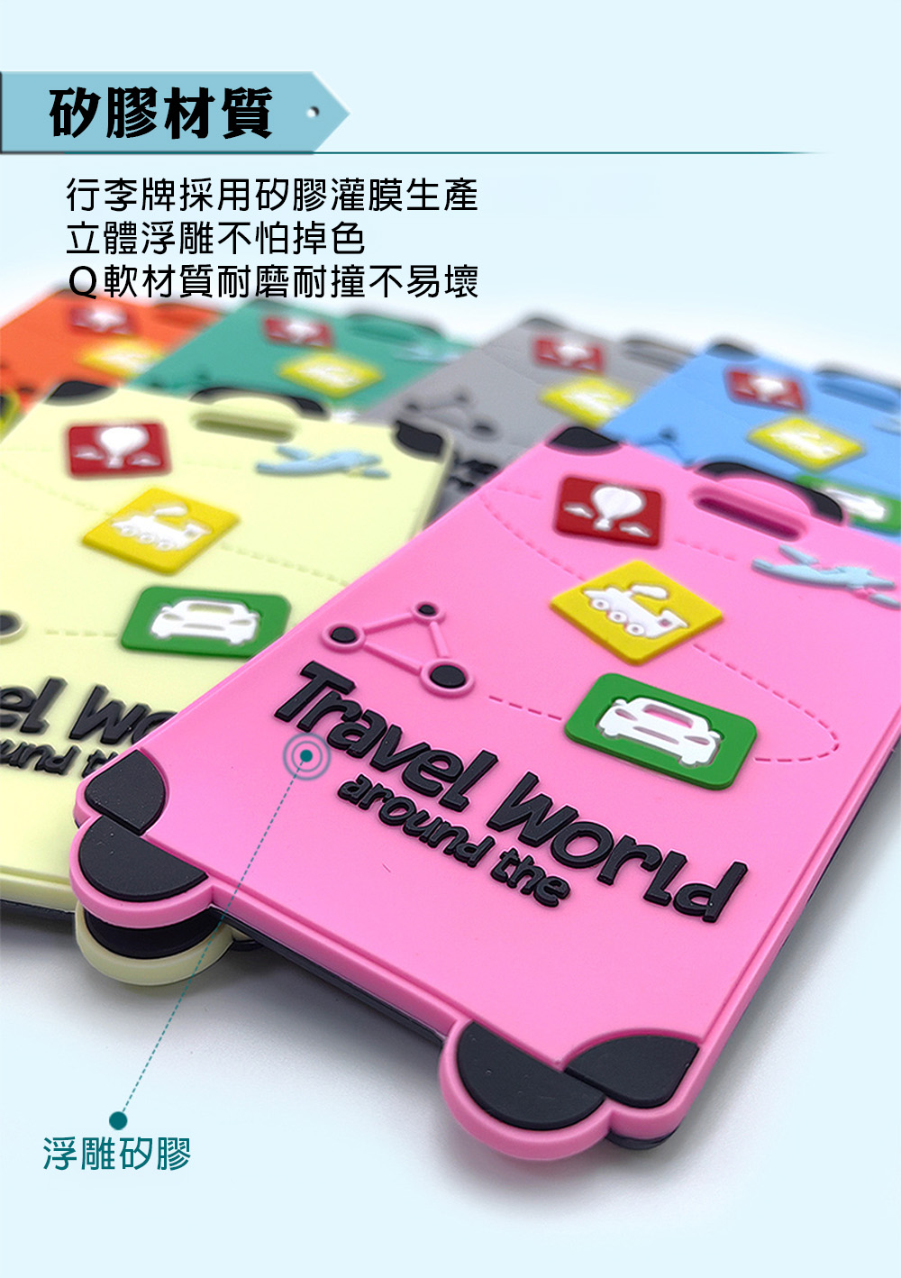 ✈️ 讓你的行李永不迷路!獨特多色行李吊牌不只防水防刮的矽膠材質背後的個資小卡,還有透明膜保護讓你的資訊不會弄髒或不見商務出差、蜜月旅行、遊學打工,隨時保護你的行李安全出國玩、返鄉過節,在行李輸送帶前一眼就認出你的行李省去找箱子的煩惱!吊牌上的旅行小圖標,陪你記錄每一段精彩旅程 🌎 特製掛帶設計,雙重卡榫堅固耐用不易掉落為你的行李箱增添獨特風格與實用保障 🧳【產品信息】產品:矽膠浮雕行李吊牌尺寸:吊牌-11*6.5cm 吊帶展開長度-15.5cm材質:正面-矽膠、背面-ABS內容物:吊牌、吊帶 個資卡、透明膜
