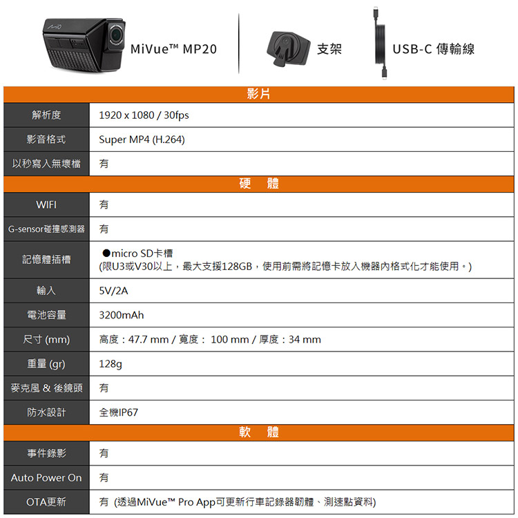 Mio MiVue MP20 勁系列 前後雙鏡頭