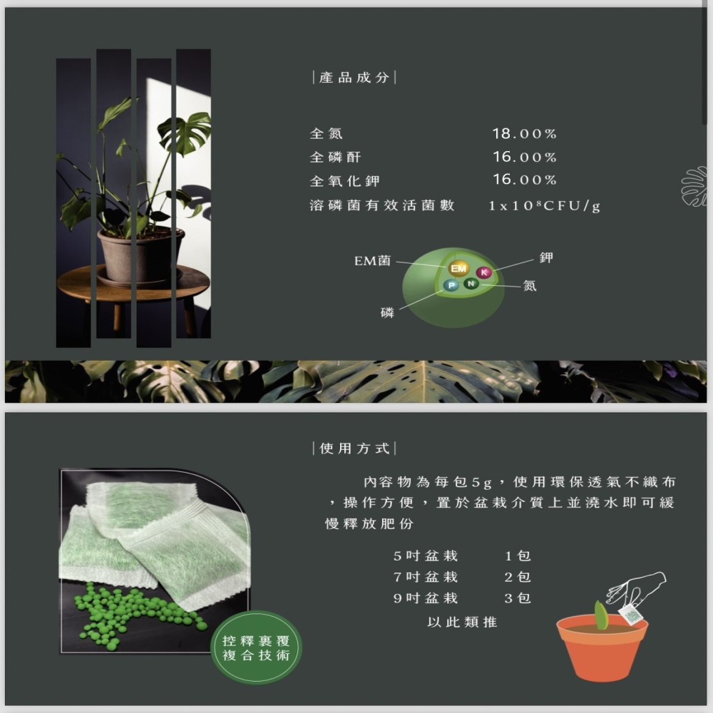 4.每顆控釋粒內皆包覆EM菌(估草桿菌)Y1336,施用後可幫助溶解介質中被固定且植物無法吸收之磷肥,幫助植物吸收肥份。