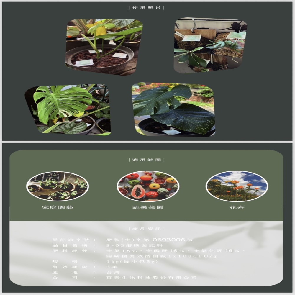 肥料成分與登記含量 : 溶磷菌有效活菌數1x10八次方CFU/g、全氮18.0%、全磷酐16.0%、全氧化鉀16.0%、溶磷(磷酸三鈣)活性1810.0ug/g-day。