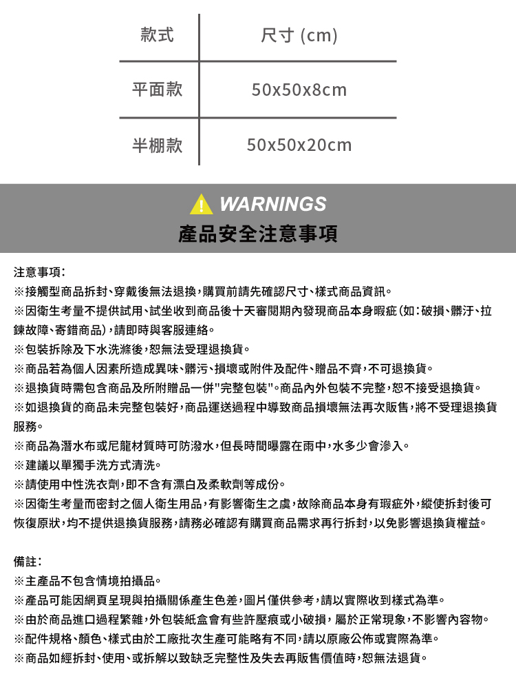 產品尺寸:平面款 50x50x9cm 半棚款 50x50x20cm