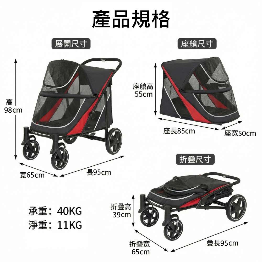 摩達客-輕便透氣HB02 輕便 透氣 好折疊 中大型寵物推車/黑紅色透網款/40KG以下貓狗適用