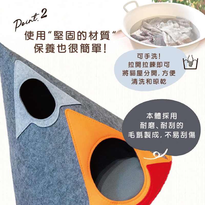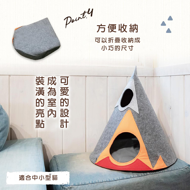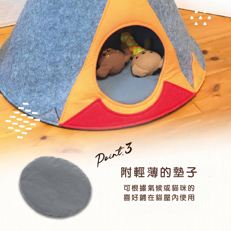 1.帳篷形房屋可以躲起來、睡覺、玩耍2.由耐磨、防刮毛氈製成,耐刮擦且易於清潔3.儲存也乾淨,可分割和堆疊4.有大小兩個入口和一個小窗戶5.附薄墊,可依氣候和愛貓喜好使用它6.適合中小型貓