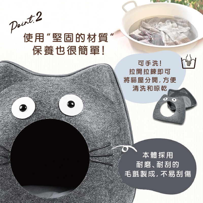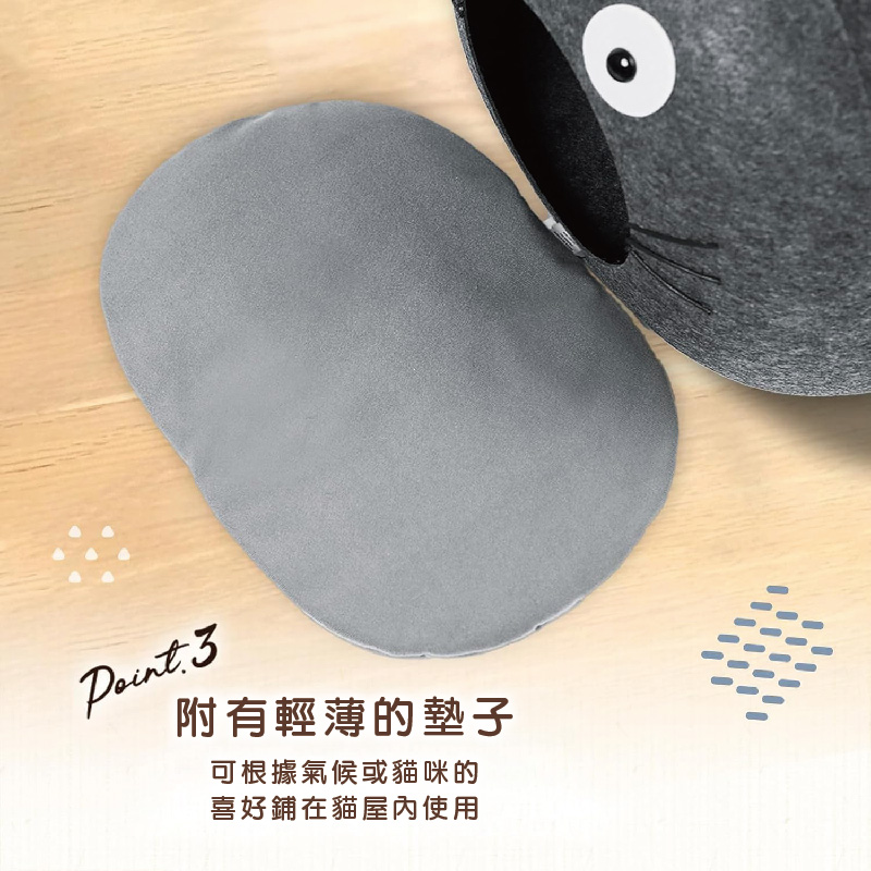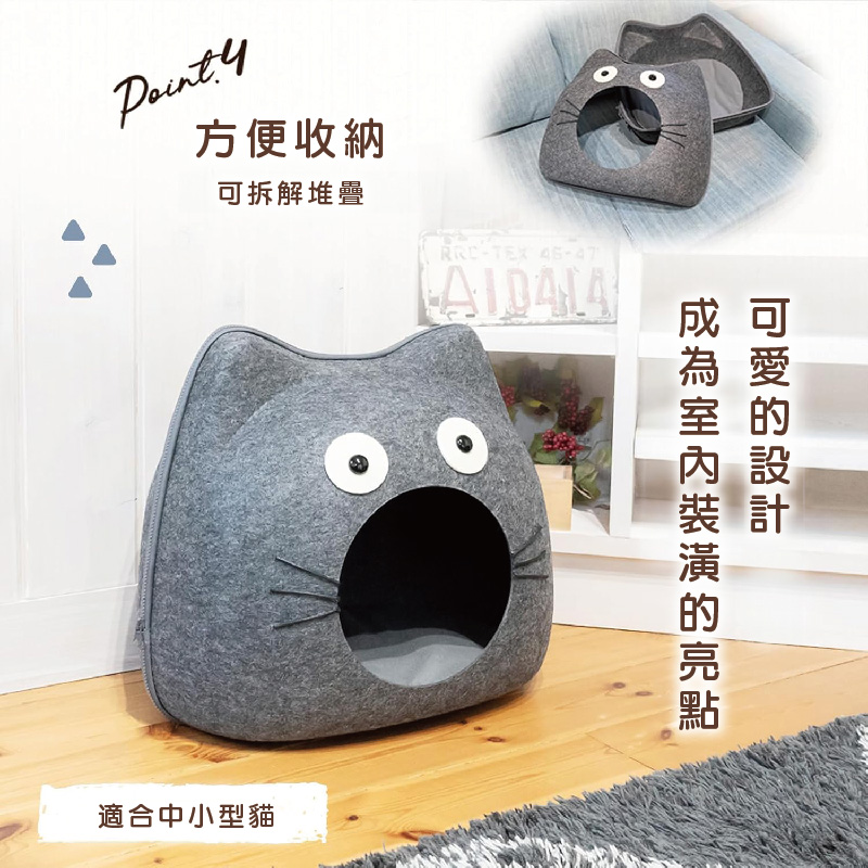 1.貓形房屋可以躲起來、睡覺、玩耍2.由耐磨、防刮毛氈製成,耐刮擦且易於清潔3.儲存也乾淨,可分割和堆疊4.附薄墊,可依氣候和愛貓喜好使用它5.適合中小型貓