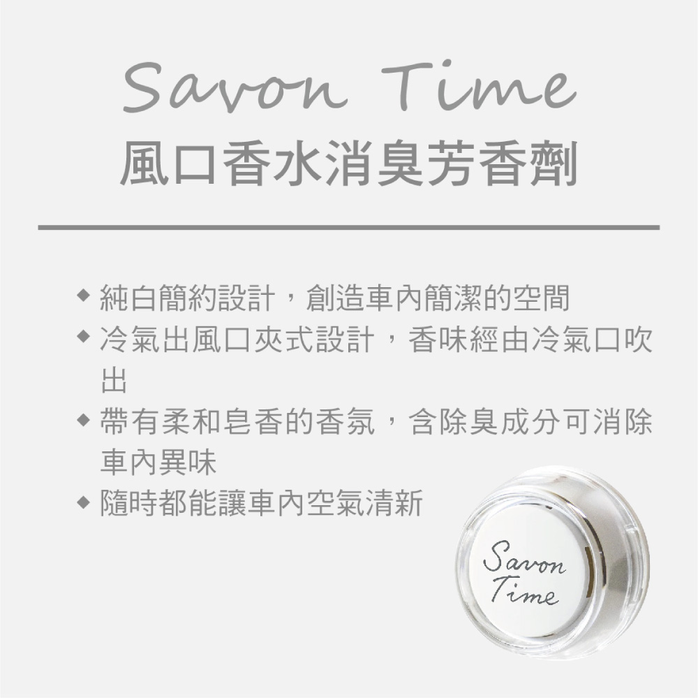 商品介紹‧ 純白簡約設計,創造車內簡潔的空間。‧ 冷氣出風口夾式設計。‧ 含除臭成分可消除車內異味。‧ 隨時都能讓車內空氣清新。3種氣味可供選擇‧ 芙洛麗麝香-令人愉悅的皂香,就像優雅的沐浴時光。‧ 棉柔浴皂-輕新柔軟的皂香,就像剛洗好的毛巾一樣。‧ 純白浴皂-清透柔和的皂香,就像剛沐浴完的清新感。規格說明‧ 品名:CARALL Savon Time 冷氣孔消臭芳香‧ 香味:芙洛麗麝香/棉柔浴皂/純白浴皂‧ 產地:日本製造‧ 容量:27g(含包裝)注意事項‧ 不可食用。‧ 請放置嬰幼兒不易拿取處。‧ 請遠離火源。‧ 放置陰涼處。