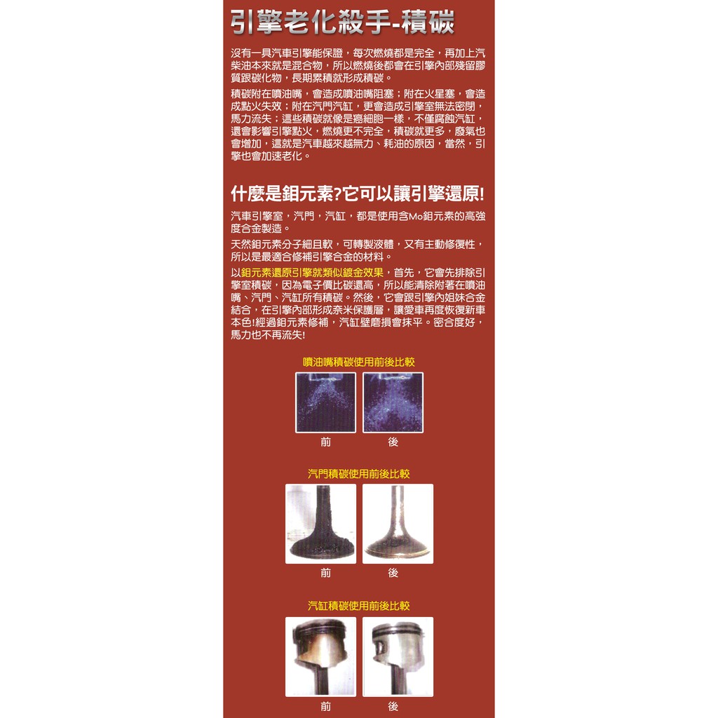 商品介紹 ‧有效清除引擎積碳,防止積碳再生,避免爆震。 ‧解決引擎運轉不順,啟動困難,抖動熄火問題。 ‧提高燃燒效率,提升馬力,降低油耗。 ‧有效降低廢氣,減少觸媒轉換器損耗。 使用方法 1.本品適用於各式柴油車輛,請添加至油箱內。 2.打開油箱蓋,將本品倒入與柴油混合。 3.油箱內40公升的柴油,每次添加鉬元素1瓶,大型車及老車,可多添加半瓶至一瓶無妨。 4.油箱內柴油需七分滿以上,讓鉬元素引擎還原劑充分稀釋。 5.每3000~5000公里添加一次即可。(本品非坊間一般揮發性除碳劑) 6.鉬元素晶體還原有規律性,保護層之厚薄不影響效果,本品多添加亦無妨。 ※適合於任何傳統柴油引擎和最新型電子燃油控制柴油引擎 (如共軌式柴油引擎等)。 規格說明 ‧品牌:SPANJAARD 史班哲 ‧品名:全效柴油精 ‧成分:液態鉬元素、航太科技碳氫化合物 ‧容量:375ml / 瓶 ‧適用:各式柴油引擎 ‧製造商:SPANJAARD 集團 注意事項 ‧請置於陰涼處存放。