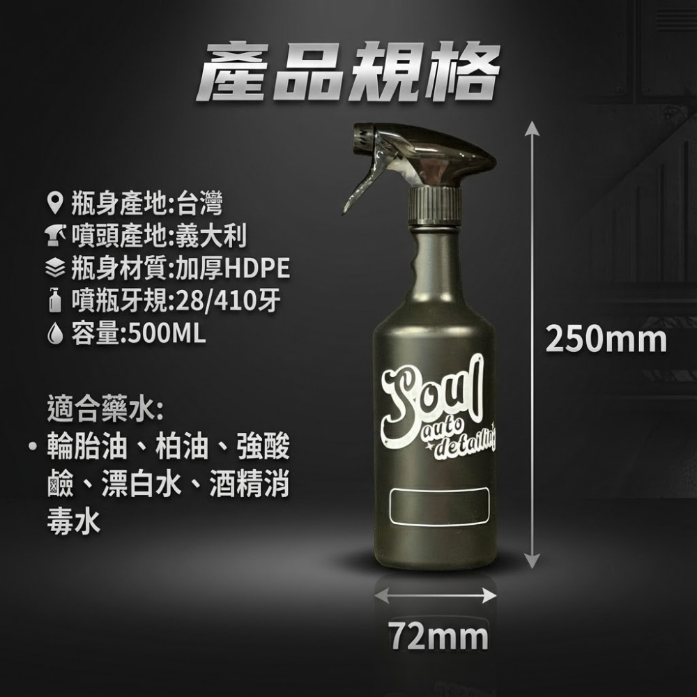 【Soul】 Soul 義大利製噴頭 耐酸鹼噴霧瓶 500ml 台灣加厚HDPE瓶身 28/410牙規 酒精噴瓶 洗車工具