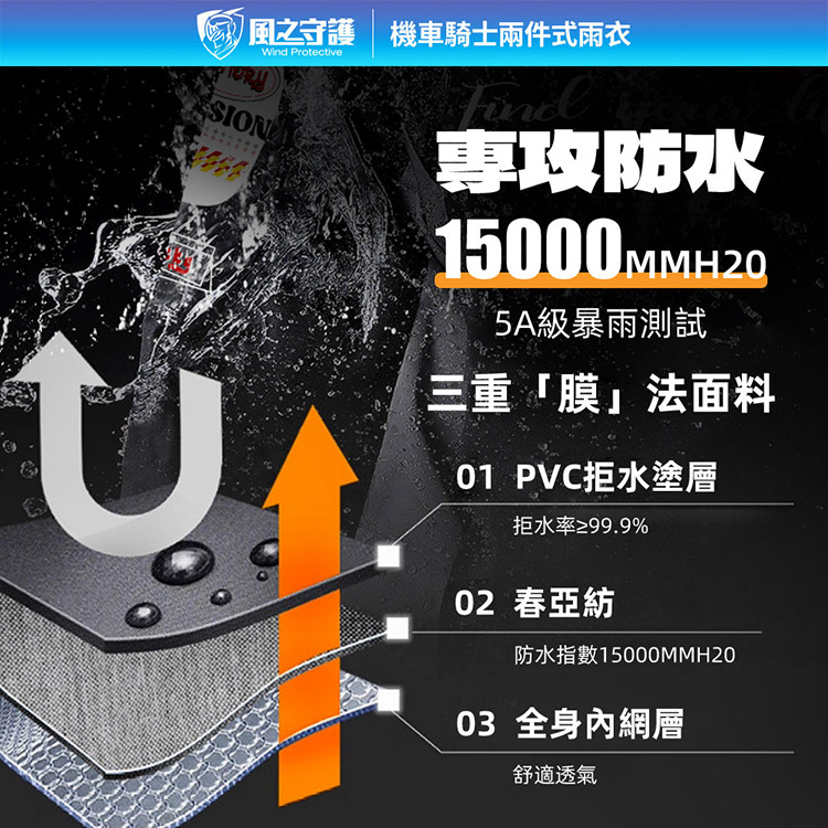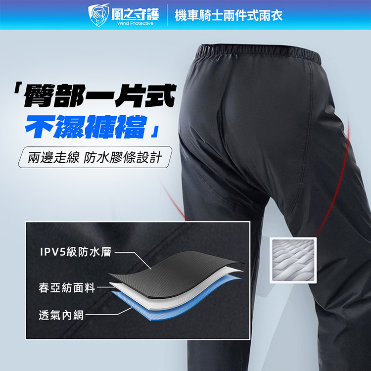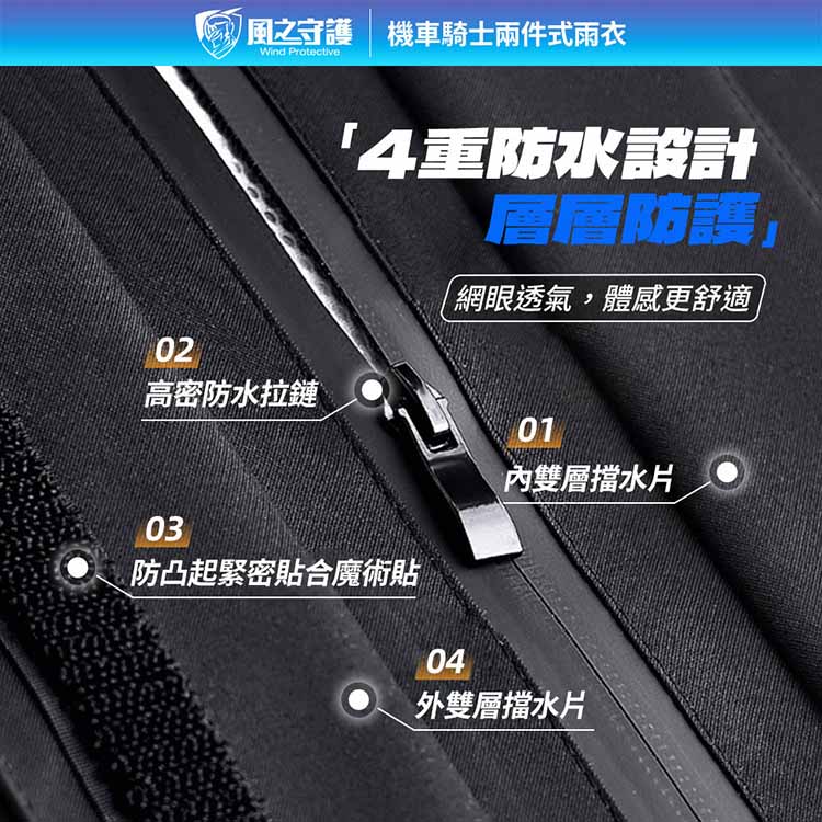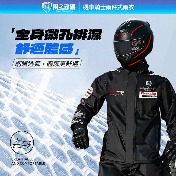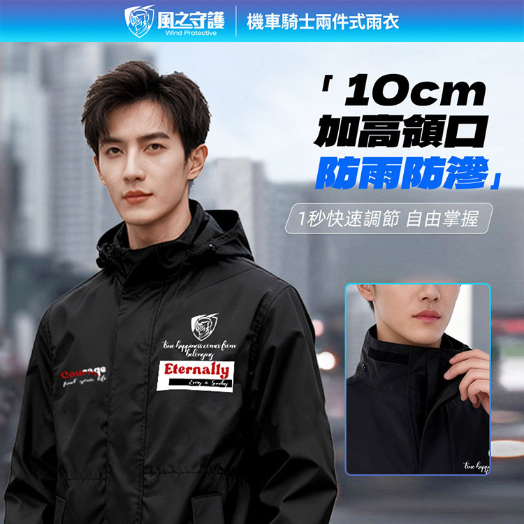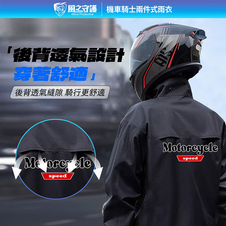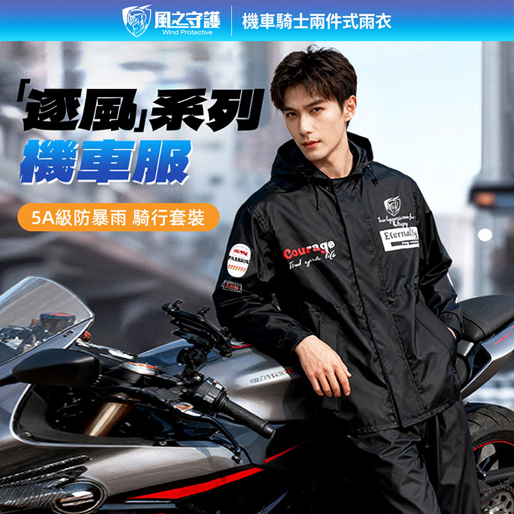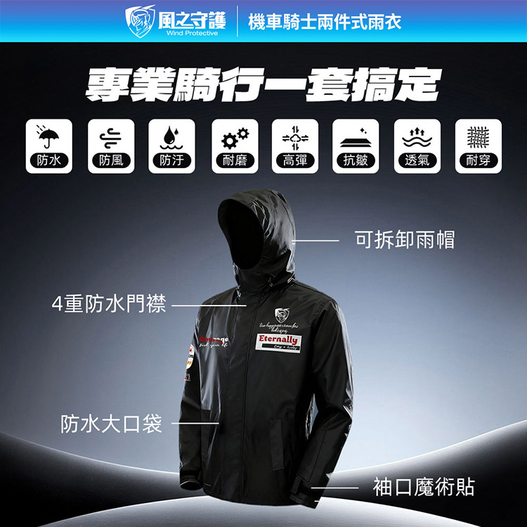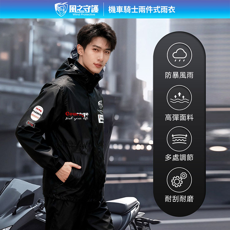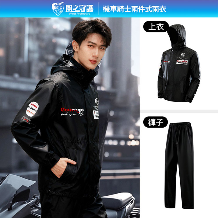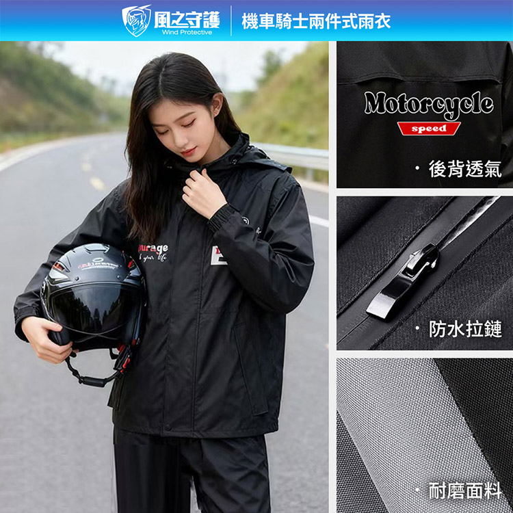 【風之守護】機車騎士-兩件式雨衣 (雨衣風衣兩用 四層防水設計 透氣不悶熱 附收納袋)-黑2XL