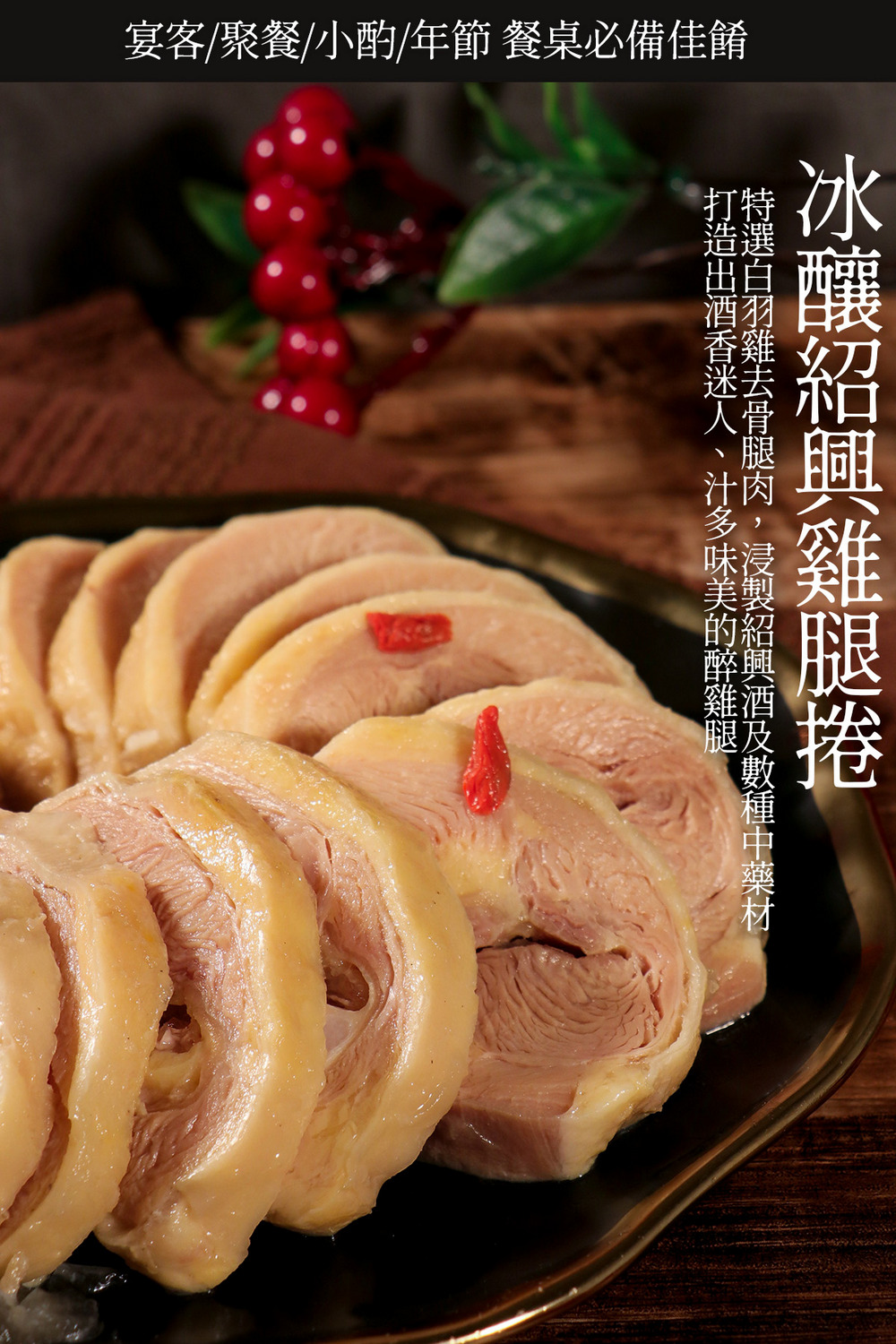 酒香濃郁 使用台灣紹興酒,自古流傳上等滋養品馥郁芬芳 搭配數種中藥材浸泡,散發獨特香氣口感細緻 選用整隻去骨腿肉製作,肉質鮮嫩多汁清香迷人 雞腿捲沁入酒香醬汁,冰釀後皮脆肉彈輕鬆上桌 冷藏退冰後,切片上桌(免加熱)享美味特選白羽雞去骨腿肉,浸製紹興酒及數種中藥材,打造出酒香迷人、汁多味美的醉雞腿。冰釀的雞腿肉,酒香濃郁、馥郁芬芳,口感溫柔細緻,清香美味令人口齒留香。皮脆肉彈、肉汁鮮美、低脂鮮嫩,百嚐不膩的好味道。退冰後切片即可上桌,輕鬆便利的宴客美肴。