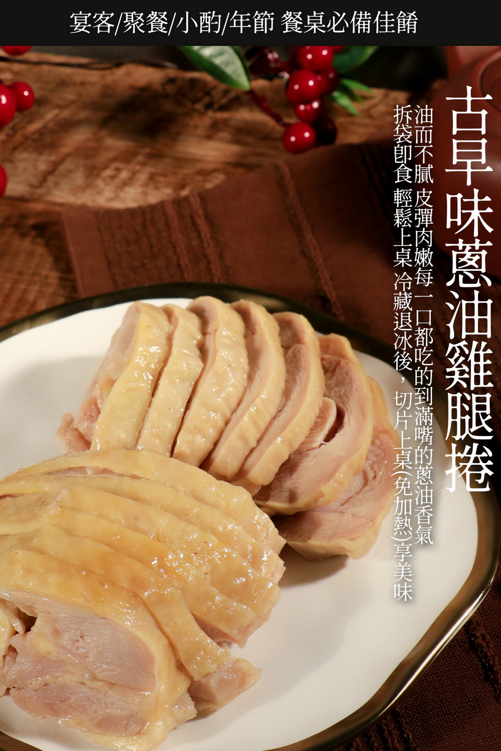 緊緻彈牙 特選飽滿厚實的去骨雞腿肉製作蔥香迷人 辛香的紅蔥頭煉油後沁入腿肉中,每一口都鮮香自然原味 人工去骨後佐鹽、糖、胡椒調味,100%無添加專業技術 透過專業設備燜煮/浸入,味道均勻滲透雞肉內油而不膩 皮彈肉嫩每一口都吃的到滿嘴的蔥油香氣拆袋即食 輕鬆上桌 冷藏退冰後,切片上桌(免加熱)享美味選用白羽雞去骨雞腿肉,人工去骨、透過調味並捲成圓筒狀後進行慢火悶煮、定型選用富滿甜味的紅蔥頭去皮削片後進行油炸,精粹出香氣濃郁的黃金蔥油碩大的雞腿捲淋上油蔥增加風味,馥郁芬芳香氣令人垂涎欲滴!雞皮脆彈、肉質飽實,入口後清爽不油膩。年節宴客、親友聚餐、休閒小酌,隨時退冰切片,輕鬆端出一盤佳餚。