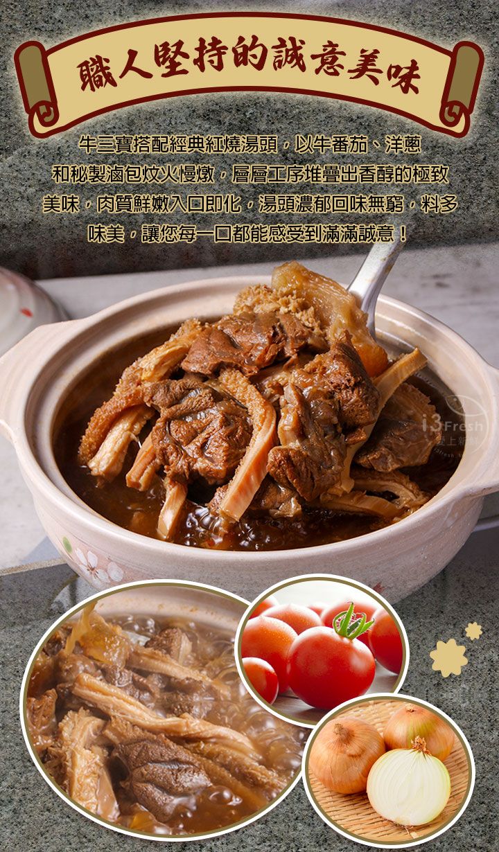 成分:水、牛肉塊(巴拉圭)、牛肚(巴拉圭)、牛筋(巴拉圭)、醬油[(水、脫脂大豆(非基因改造)、小麥、鹽、轉化液糖(蔗糖、水)、酒精、調味劑(琥珀酸二鈉、5'-次黃嘌呤核苷磷酸二鈉、5'-鳥嘌呤核苷磷酸二鈉)、甜味劑(甘草素)]、辣豆瓣[(辣椒、水、非基因改造黃豆、黏稠劑(乙醯化己二酸二澱粉)、麻油、調味劑(L-麩酸鈉、5’-次黃嘌呤核苷磷酸二鈉、5’-鳥嘌呤核苷磷酸二鈉)、糖、黏稠劑(玉米糖膠)、乳酸)]、蔥、洋蔥、牛番茄、蕃茄糊、番茄醬(水、番茄糊、高果糖糖漿、鹽、醋)、老薑、鹽、米酒、牛晶粉[(鹽、L-麩酸鈉、糖、香料、麥芽糊精、玉米澱粉、牛油、水解玉米蛋白(水解玉米蛋白、麥芽糊精、鹽、葵花籽油)、牛肉風味調味料[牛肉萃取物(鹽、牛肉、麥芽糊精)、鹽、L-麩酸鈉、牛油、焦糖色素、5'-次黃嘌呤核苷磷酸二鈉、5'-鳥嘌呤核苷磷酸二鈉]、牛肉萃取物[牛肉萃取物、牛骨高湯(牛骨、鹽)、鹽、分離大豆蛋白、大豆卵磷脂]、洋蔥粉、焦糖色素、調味劑 (5’-次黃嘌呤核苷磷酸二鈉、5’-鳥嘌呤核苷磷酸二鈉)、二氧化矽、大蒜粉、檸檬酸、黑胡椒粉)]、糖、老抽(水、大豆、糖、鹽、小麥粉)、蒜、滷包(八角、小茴香、花椒、肉桂、豆蔻、乾薑)、八角、己二烯酸鉀(防腐劑)、雞粉(鹽、麥芽糊精、蔗糖、雞肉粉、雞油、酵母抽出物、胺基乙酸、DL-胺基丙酸、5' -次黃嘌呤核苷磷酸二鈉、5' -鳥嘌呤核苷磷酸二鈉、醬油粉、琥珀酸二鈉)