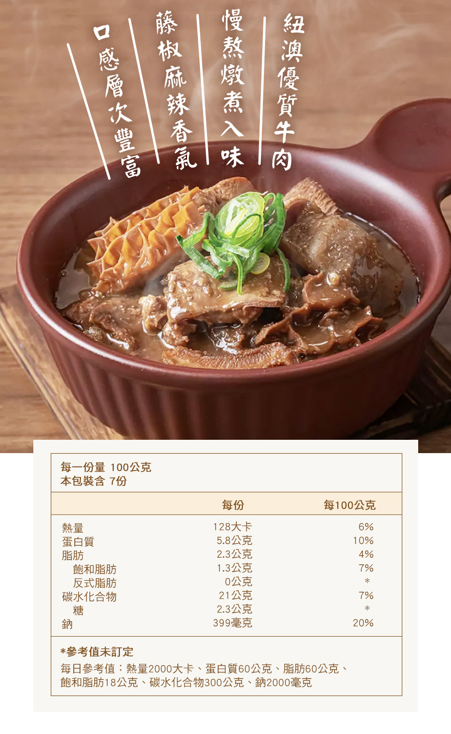 牛肉(巴拉圭)、牛肚(紐西蘭)、牛筋(紐西蘭)、辣椒醬、金蘭甲等醬油、鮮辣汁、藤椒雞汁、花椒粉、辣椒粉、大骨粉、五香粉、粗薑絲、蒜、辣椒片