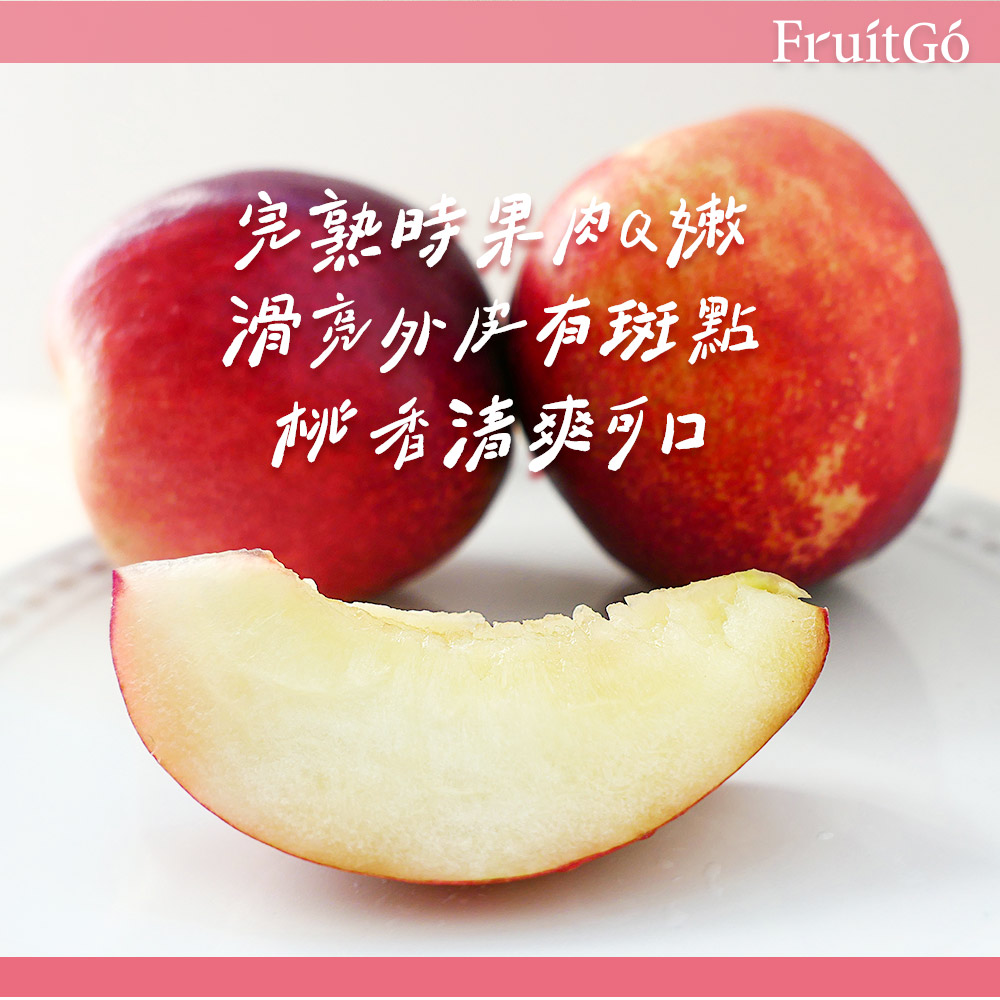 滑亮外皮,完熟時果肉Q嫩白甜桃 Nectarine 與水蜜桃 Peach 外型相似,但白甜桃表皮光滑無絨毛。馥果嚴選陽光充足、水源純淨的果園。◎ 白甜桃口感較水蜜桃脆口、完熟時果肉Q嫩。◎ 滑亮外皮富有光澤,果皮顏色粉中帶紅。◎ 清爽桃香、香甜可口,甜中帶微酸。多酚類在新鮮成熟的桃肉、桃皮中最多,是很好的抗氧化營養素!富含維他命C也能提升免疫力與養顏美容。