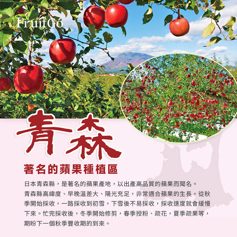 日本青森新鮮直送,不上蠟的天然蘋果來自日本蘋果重鎮 —「青森縣」青森縣高緯度、早晚溫差大、陽光充足,非常適合蘋果的生長。從秋季開始採收,一路採收到初雪,下雪後不易採收,採收速度就會緩慢下來。忙完採收後,冬季開始修剪,春季授粉、疏花,夏季疏果等,期盼下一個秋季豐收期的到來。