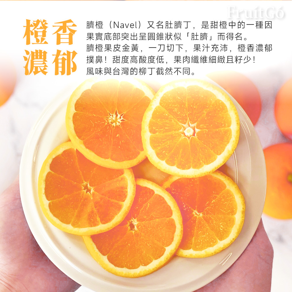 臍橙果汁充沛,橙香撲鼻臍橙(Navel)又名肚臍丁,是甜橙中的一種,因果實底部突出呈圓錐狀似「肚臍」而得名。臍橙果皮金黃,一刀切下,果汁充沛,橙香濃郁撲鼻!甜度高酸度低,果肉纖維細緻且籽少!風味與台灣的柳丁截然不同。臍橙通常會比一般甜橙大一些,擁有大量維生素C、胡蘿蔔素與其他營養素,也有「甜橙中的貴族」的美稱。盛夏的消暑神器臍橙盛產於美國、澳洲、南非等,適合在溫暖潮濕的亞熱帶地區生長。果汁充沛,甜度高的臍橙,讓你盛夏時一顆接個一顆,營養又消暑!☀️保存|冷藏約2-3週,提早食用風味較佳。