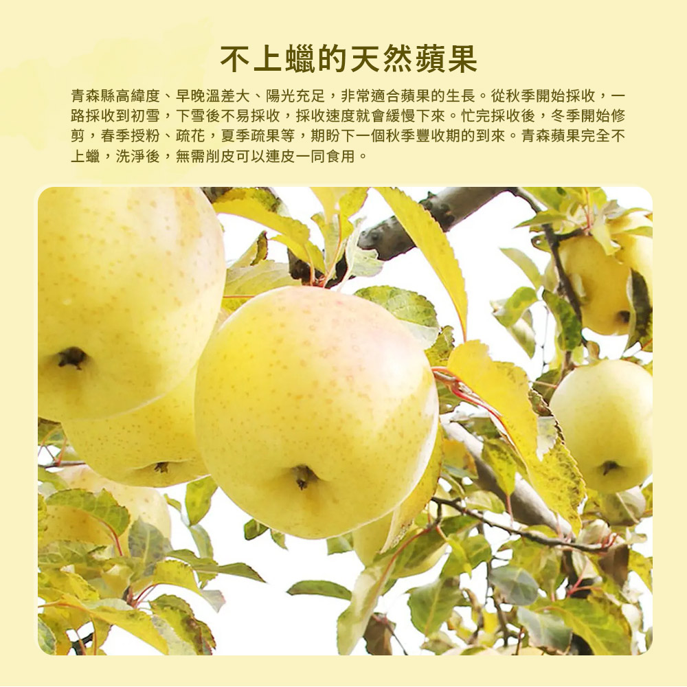 果皮如奶油般光滑,口感香甜!蘋果香濃郁,香氣有別於紅色蘋果,小編認為帶有點牛奶香,非常特別!吃起來甜度適中、脆口!幾乎無酸度!因外型雪白,與香氣獨特,是春節送禮的最佳選擇!日本青森新鮮直送,不上蠟的天然蘋果來自日本蘋果重鎮 —「青森縣」青森縣高緯度、早晚溫差大、陽光充足,非常適合蘋果的生長。從秋季開始採收,一路採收到初雪,下雪後不易採收,採收速度就會緩慢下來。忙完採收後,冬季開始修剪,春季授粉、疏花,夏季疏果等,期盼下一個秋季豐收期的到來。青森蘋果完全不上蠟,洗淨後,無需削皮可以連皮一同食用。☀️ 保存|冷藏保存3週,室溫保存1週。建議提早食用脆度較佳。☀️ 青森蘋果完全不上蠟,洗淨後,無需削皮可以連皮一同食用。