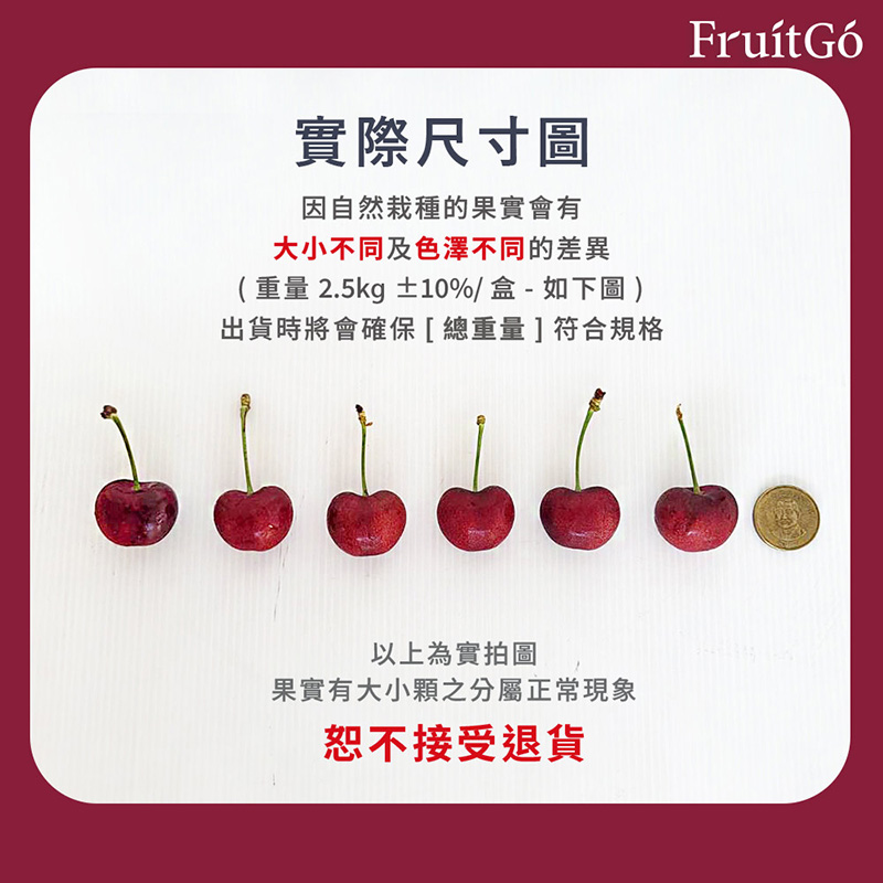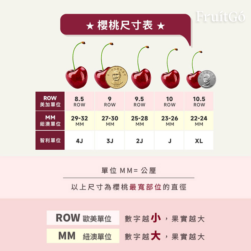 品質、品質、品質!買櫻桃最怕買到不好吃的!市面上有櫻桃品種多到數不清,每個品種的櫻桃味都有些不同。重點來了!!!"對的時間點吃對的品種"馥果每天到桃園機場品檢新鮮到的櫻桃,專業幫您挑選每天最好吃、品質最好的那一批!色澤艷麗,果實光滑碩大,皮薄肉厚!櫻桃香甜多汁的果肉,又帶點微微的酸味,恰到好處的完美搭配,讓櫻桃成為水果禮盒的最佳選擇。酸酸甜甜多汁的櫻桃,讓人一口接一口,回味無窮。現正是南半球的夏季,春夏有著充足的日照,可說是櫻桃的最佳產地。紐西蘭擁有得天獨厚的氣候,島上有著豐富的火山地形,而肥沃的火山土壤以及溫和宜人的氣候,都能讓櫻桃有著良好的生長環境。☀️保存|❶ 收到後一定要冷藏,櫻桃果肉降溫至少需冷藏5小時,才能恢復櫻桃果肉脆度。❷ 櫻桃保存須保持乾燥,食用前再清洗櫻桃,才不會濕氣太高讓櫻桃腐壞喔!❸ 櫻桃嬌嫩,請避免壓傷。新鮮櫻桃建議收到後3~5天內享用完畢。