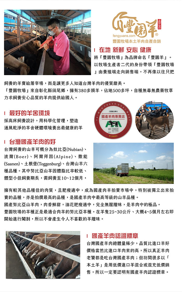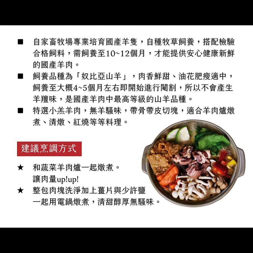 本產品為豐園羊牧場養殖的努比亞小羔羊,與進口羊肉相比,較無羊羶味且羊皮Q肉嫩、有嚼勁,適合燉煮羊肉爐或羊腩煲。