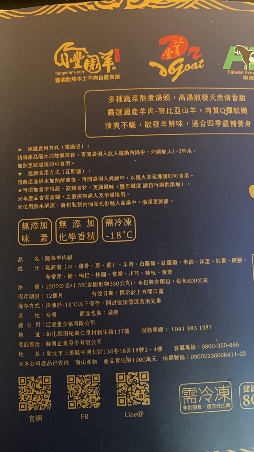 淨重: 1200公克 ±1.5%(含固形物350公克)商品成分:雞高湯(水、雞骨,蔥、薑)、羊肉、米酒、白蘿蔔、紅蘿蔔、洋蔥、海帶芽、紅棗、當歸、枸杞、桂圓、川穹、桂枝、黃耆、碘鹽、糖保存期限:冷凍1年, 標示於包裝下方開口處