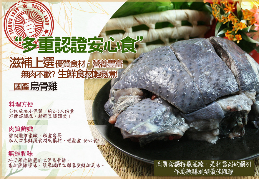 來自雲林純淨牧場的頂級華陀雞採低密度自然放養、雞隻堅持自然熟成細緻的肌肉纖維,渾然天成的彈牙口感多項藥物殘留檢驗合格擁有專業品質認證的安心食材烏骨雞與其他禽類商品(全雞、火雞、鵝肉)相比較,不僅脂肪、熱量最低,適合愛美人士滋補之用外,各 種營養素也高於其他禽品許多,可謂之雞品中的珍品。不光是如此,烏骨雞的維生素A的含量更高於鰻魚10倍,鐵的含量更勝菠菜10倍,對於屬高缺鐵群 13~34歲的女性而言,適合作為全年食用。富含多種蛋白質、礦物質、維生素,肉質鮮嫩甘美、潤澤順口,是雞中珍品。華陀雞之品種特色:黑皮、黑肝、黑心、黑胗、黑骨。肉質含獨特氨基酸,是相當好的藥引,作為藥膳進補最佳雞種。其藥用和食療作用,更是肉雞所不能相比的,被人們稱作“名貴食療珍禽”烏骨雞肉中還含有豐富的維生素以及鐵、銅、鋅等多種微量元素,膽固醇含量較低,適合老人、兒童、產婦及久病體弱者食用。孕婦產前產後調養、生病體弱的營養補給、青少年轉骨湯、銀髮族養生湯,男人要補元氣、女人要養顏,適合全家人四季湯品的養生食材首選!